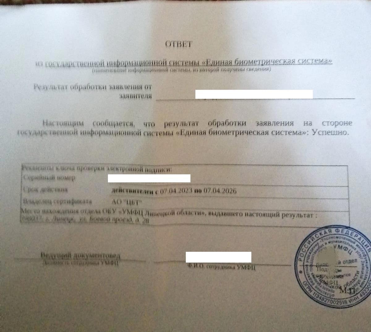 Тетенька перевернула этот лист и в самом верху оказалась малюченькая узенька печатная строчка: "ОТВЕТ из государственной информационной системы"Единая биометрическая система" с результатами регистрации статуса ФЛ от сбора биометрии6 "Статус обработки заявления на стороне ЕБС: УСПЕШНО""