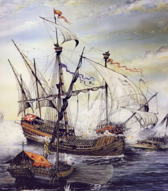 Венецианский галеон Алессандро Бондумьеро отражает атаку галер Хайретдина Барбароссы в битве у Превезы, 1538 год. Сражение христиане проиграли, но Бондумьеро утопил три галеры мусульман, увёл свой повреждённый корабль и присоединился к союзникам.