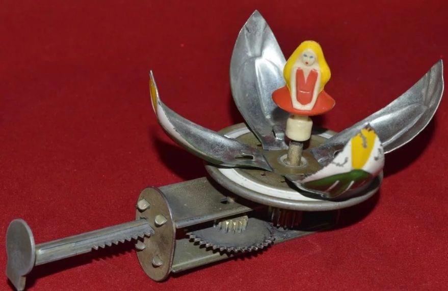 Из прикольных штук нашла две. У меня были такие же. Первая - "дюймовочка". Надавливаешь со всех сил на стержень - и она начинает вращаться, одновременно раскрываясь. Жуткий агрегат! Запросто можно порвать кожу, прищемить пальцы, пораниться об острые углы "лепестков" - но как же она мне нравилась! Механизм, однако!