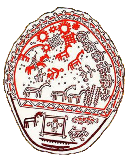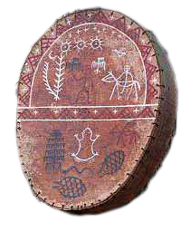 Полотно красками делили на 2 зоны – верхняя представляла Мир Небес, а нижняя – Мир Под-земный, черта разделяющая полотно – представляла наш мир. В зависимости от информации, выведанной у духа бубна, на полотно ложились священные рисунки. Верхнюю часть заполняли рисунки Светила-Солнца, Луны, звёзд, радуги, сакральных деревьев – берёзы и тополя, духи-защитники кама в птичьих обличьях. В нижней зоне полотна рисовали людей, всадников на конях, людей, сидящих в санях, медведей, змей, лягушек, деревья, и образ самого шамана. По краю полотна рисуется своеобразный контур – в виде зигзагов и прямых линий. По количеству рисунков определяли духов-помощников кама, чем их больше – тем сильнее считали шамана. Художественное искусство представляло собой целый удивительный и таинственный мир символов, понятный лишь самому шаману и его духам. Это и карта, по которой он связывался со своими покровителями, помощниками, это путь для ориентации в просторах мироздания.