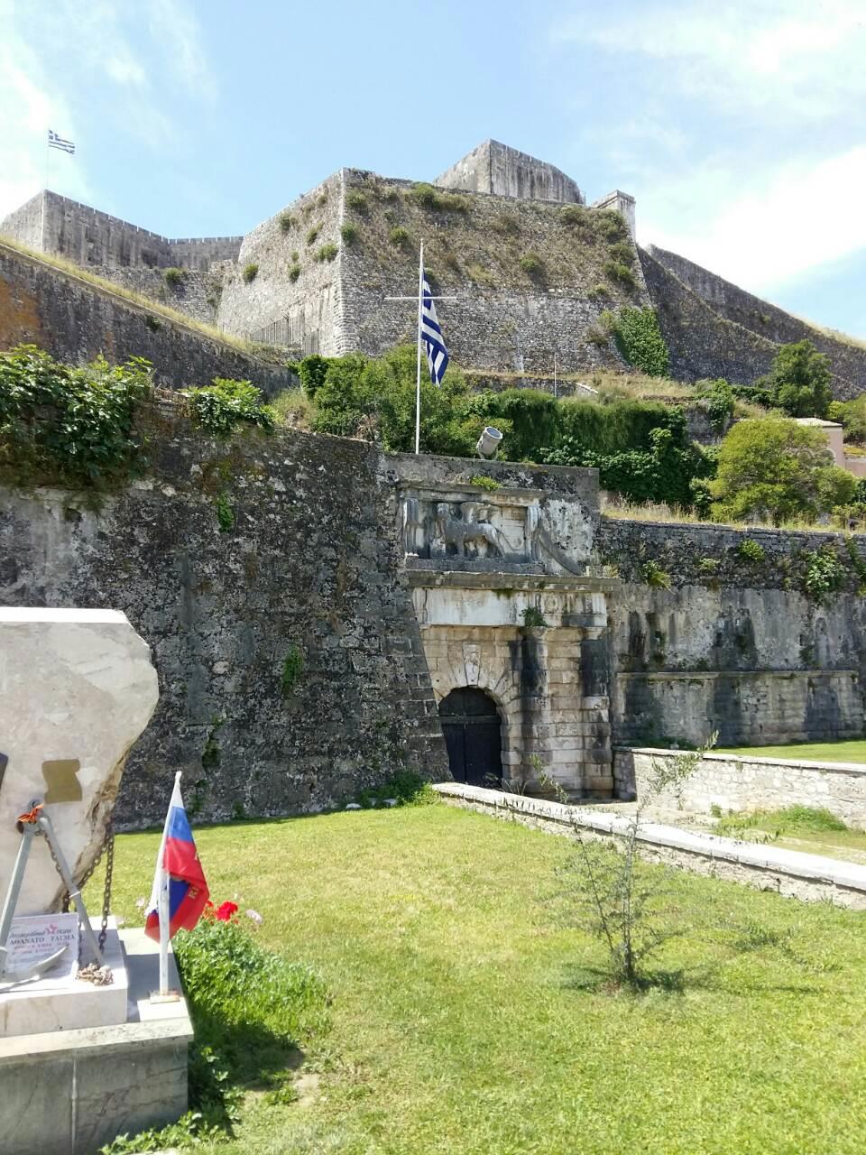 Очень позитивное фото - над входом в крепость , гоударственный флаг Греции , рядом с барельефом адмирала , российский флаг . Здесь с памятниками не воюют .