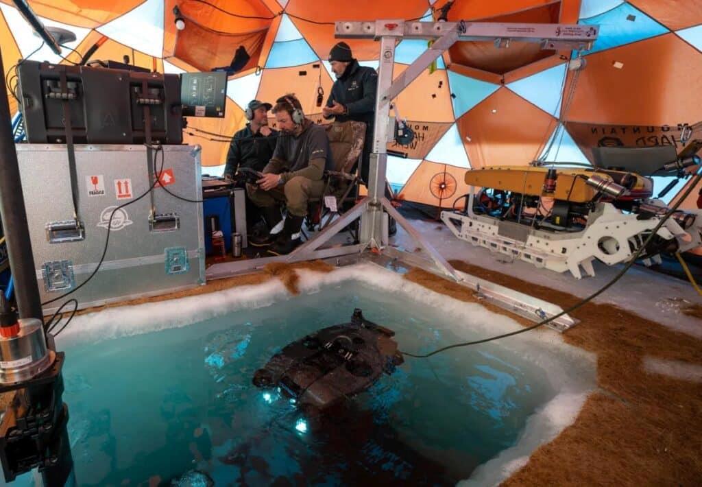 (Подводная археология в условиях Арктики: над прорубью натянут купол с необходимой аппаратурой. Обе фотографию показывают работу археологов с корпусом "Эребуса")