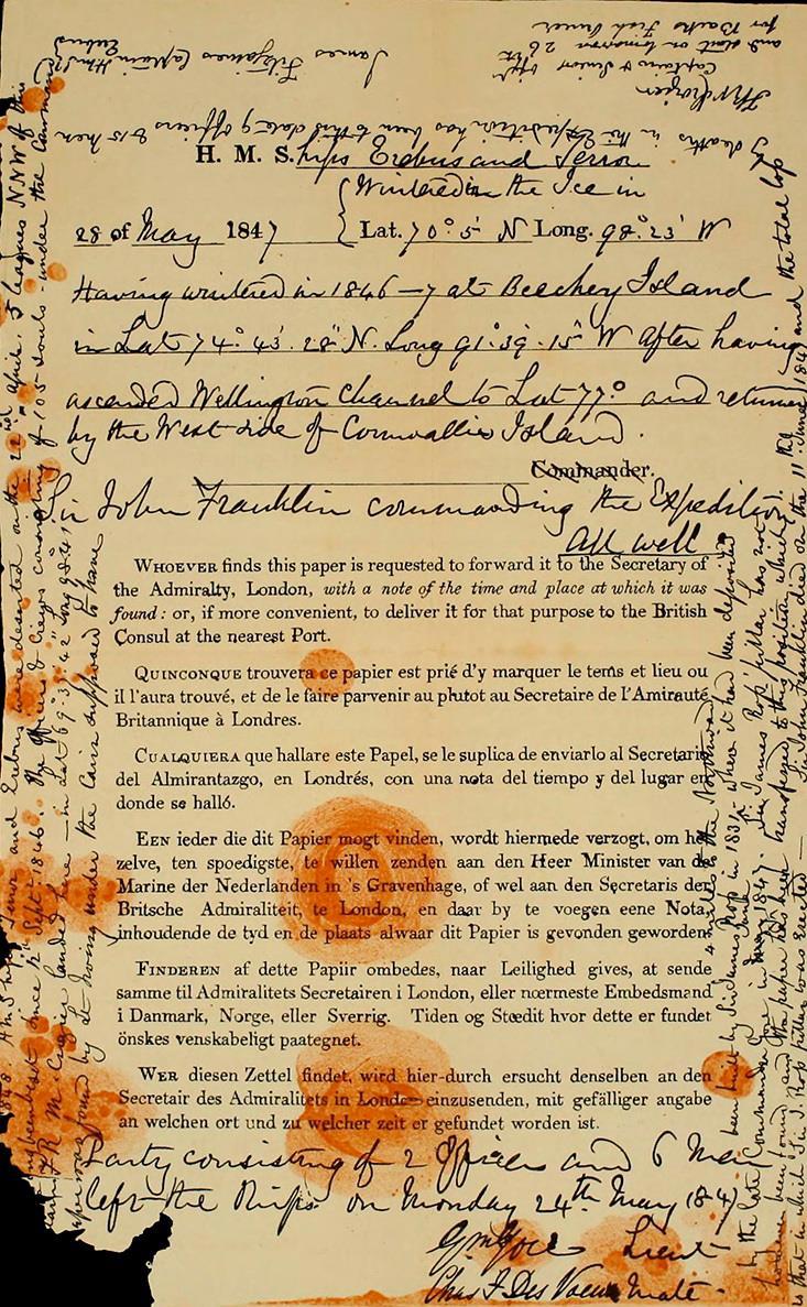 «28 мая 1847 года. Корабли Ее Величества „Эребус“ и „Террор“ зимовали во льду под 70°5′ с. ш. и 98°23′ з. д. Зиму 1846—1847 годов провели у острова Бичи под 74°43′28″ с. ш. и 91°39′15″ з. д., предварительно поднявшись по проливу Веллингтона до 77° северной широты и вернувшись по западной стороне острова Корнуоллис. Экспедицией командует сэр Джон Франклин. Все в порядке. Партия из двух офицеров и шести матросов покинула корабль в понедельник 24 мая 1847 года».