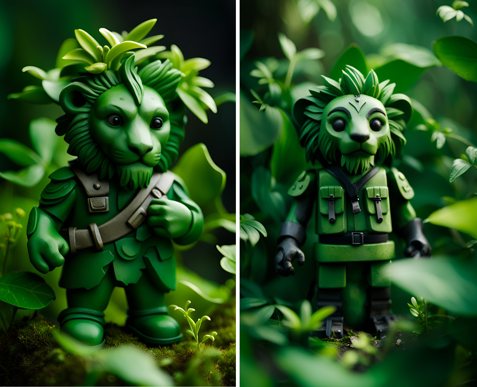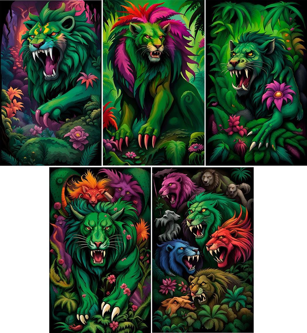 Мне очень нравится, как нейронка смешала элементы реального льва с растительностью. Дополнительные цветовые варианты тоже уместны, ведь мои Львы носят костюмы, которые меняют цвет под окружение.
