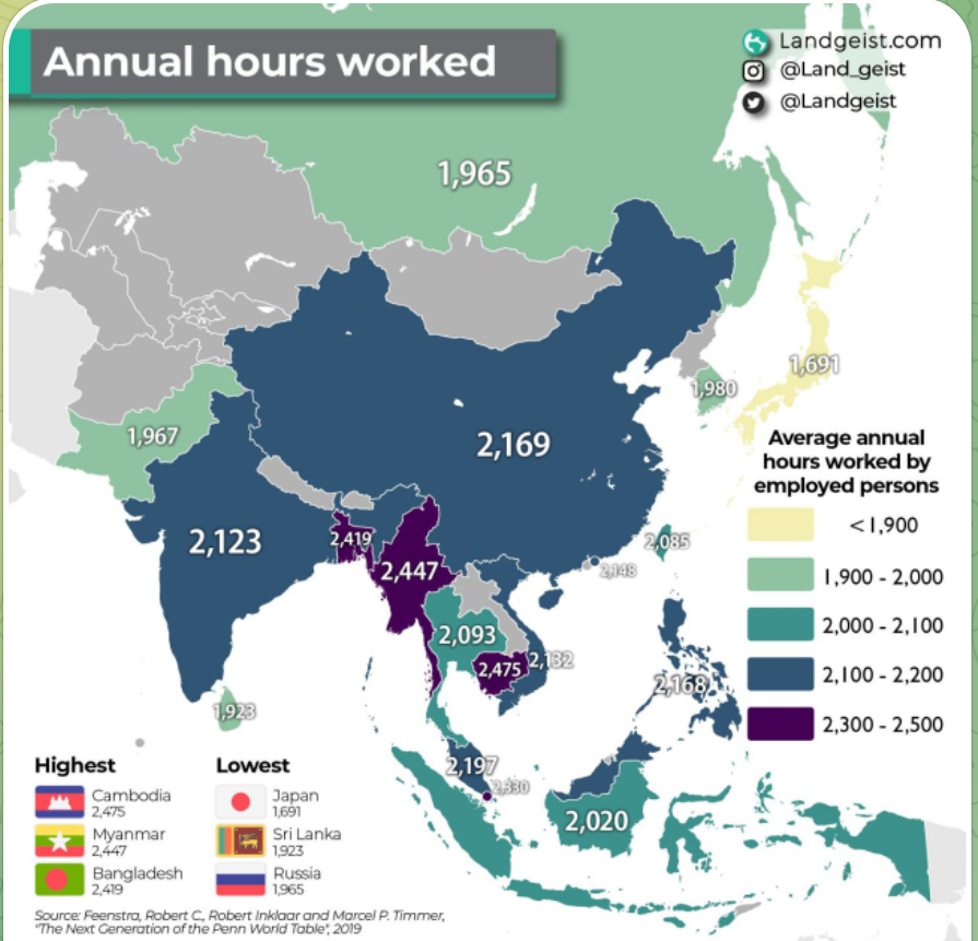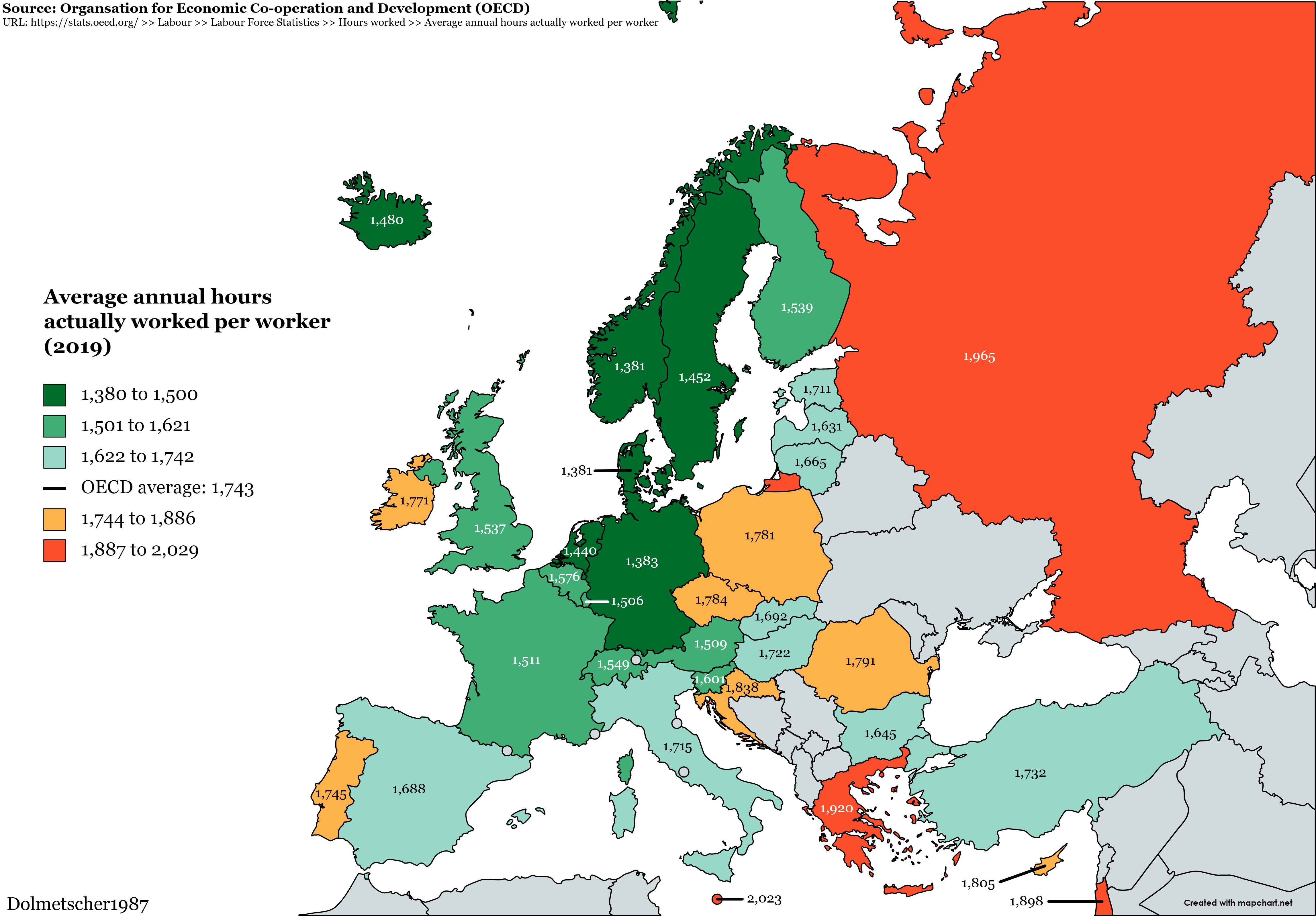 Указано количество рабочих часов в год (если по картинке кликнуть, то она будет крупнее). Данные за 2019, но не думаю, что что-то радикально изменилось.