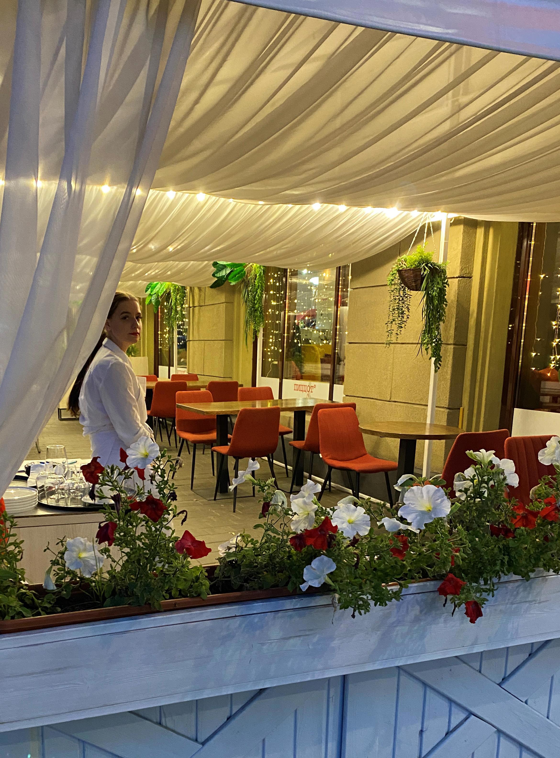 То вот - сходили с внучкой в пиццерию. Вышли - восьмой час, темно... Лето закончилось, скоро уберут уличные столики. Уже сейчас по темноте почти нет посетителей. Только официантка копается в телефоне...