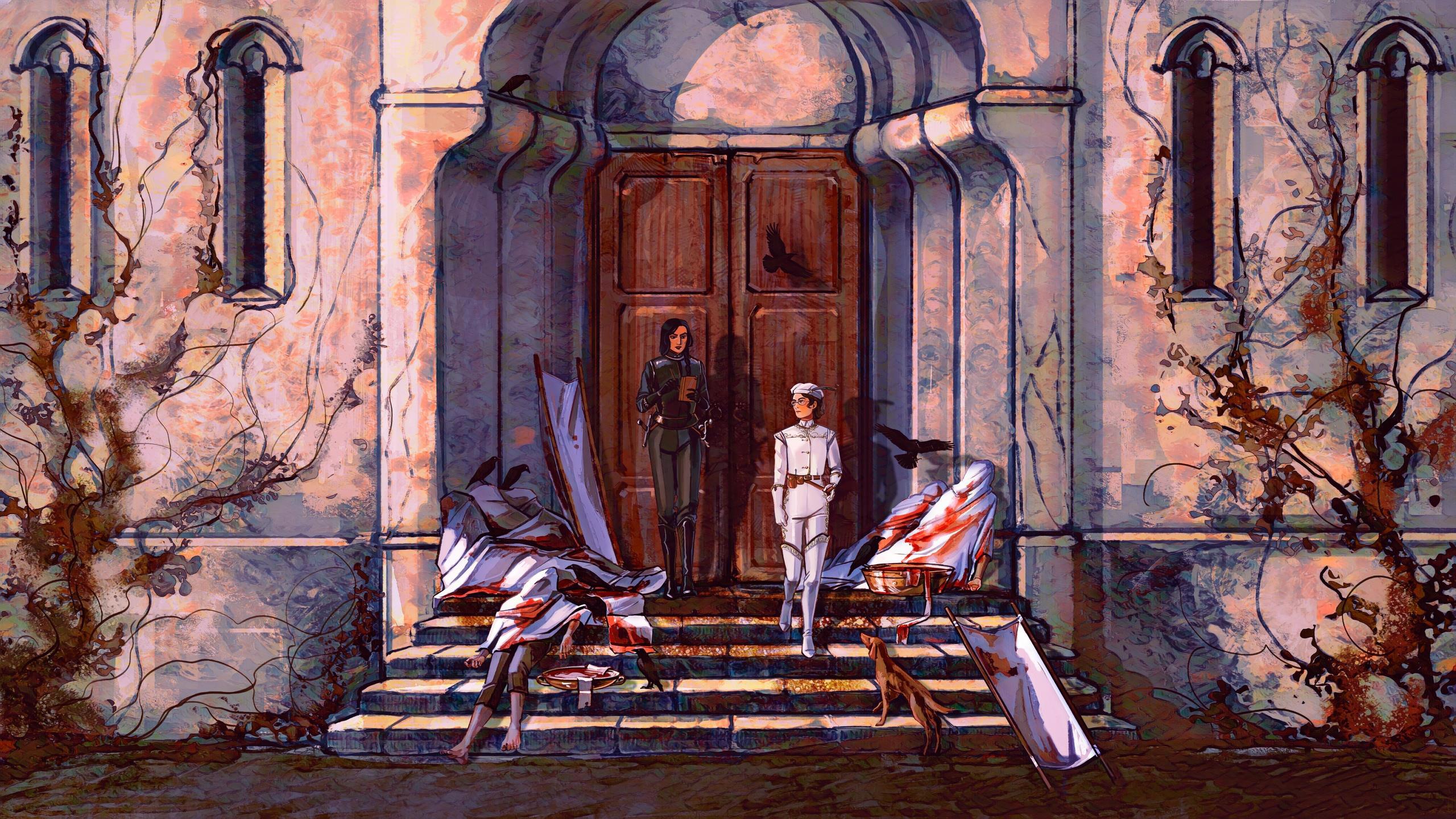 Иллюстрация Даши Кайдаловой ака Ёуки - Жанна и Роза на ступенях госпиталя для беженцев, который Роза взяла под опеку, получив место в правительстве мятежников.