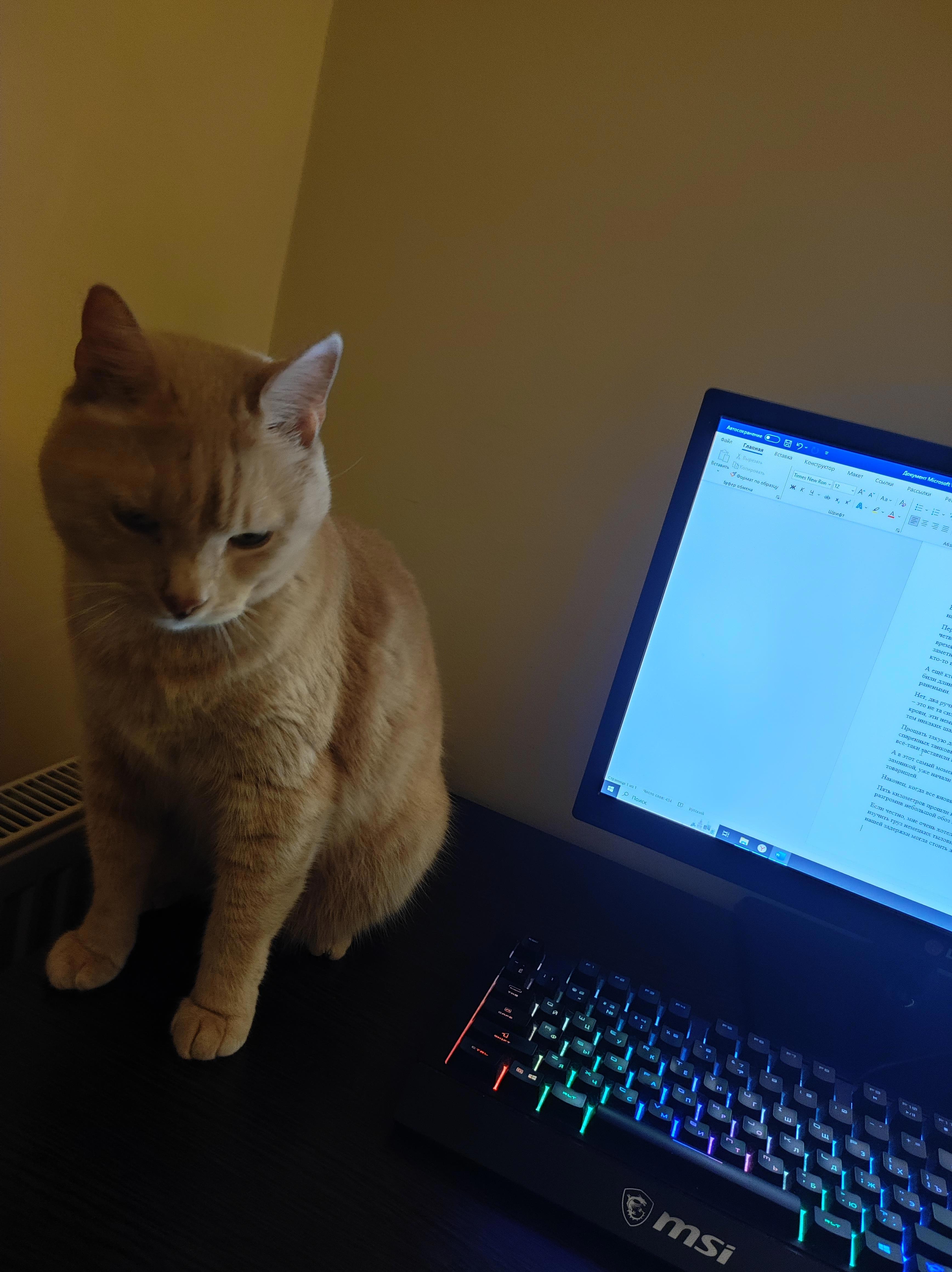 Именно этот рыжий кот, приходит, начинает нагло тереться об ноги и мурчать (чего с этим ленивым животным не было уже с пол-года! ). А потом влазит на стол и смотрит таким взглядом, будто говорит - "Какого чёрта так мало пишешь, кожаный?! "