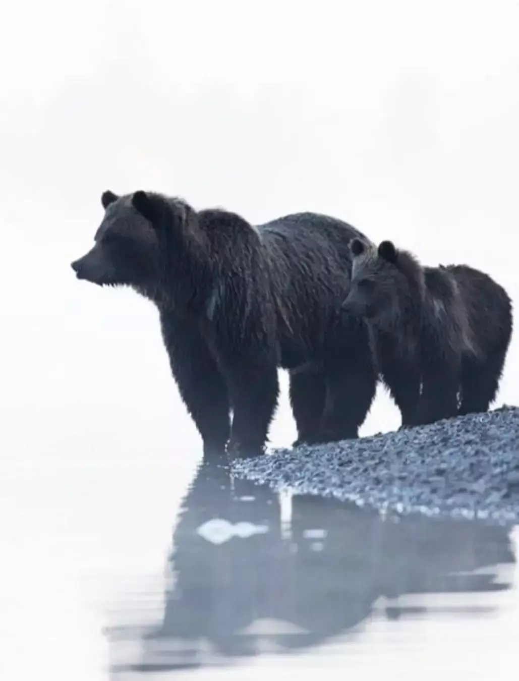 Мама и "мелкий" гризли туманным утром на Аляске.