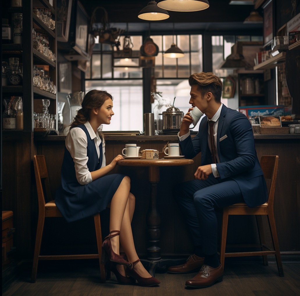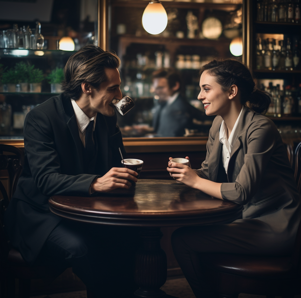 Слева - у него - кружка во рту; Справа: у него тоже что-то непонятное около рта, а у неё - три ноги.