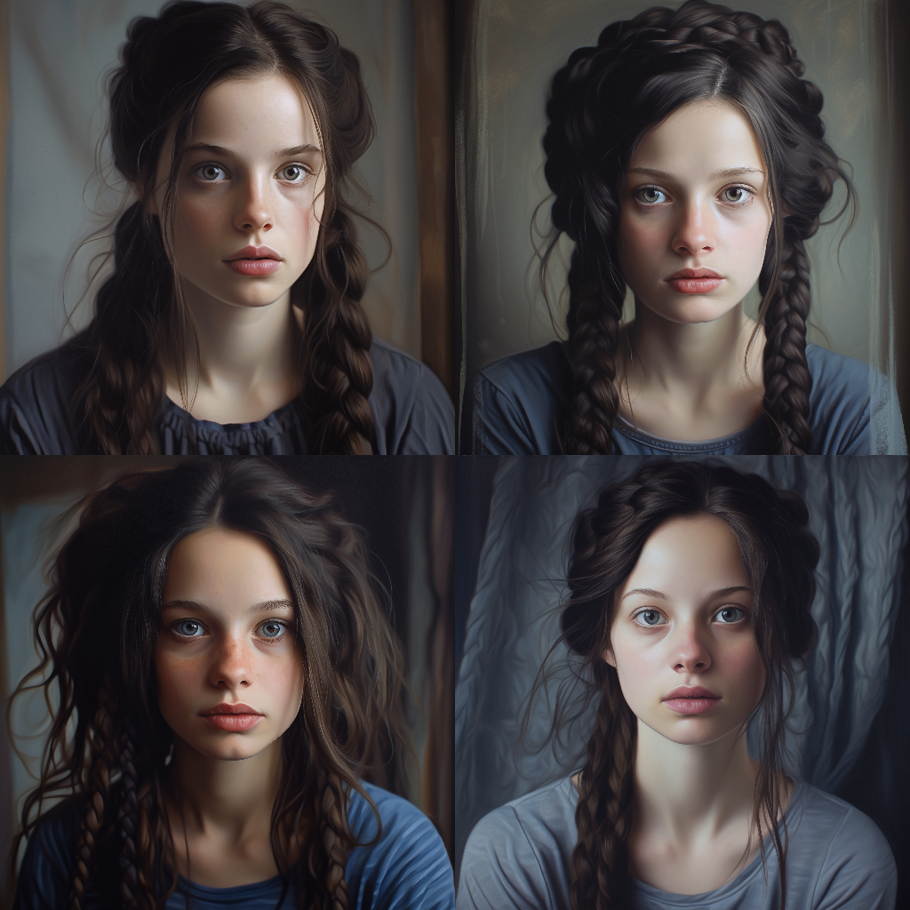 Потом решила, что она слишком идеальна для сиротки, и сгенерила что-то более соответствующее, поэтому если кому нравится этот ребёнок - пишите, скину картинку покрупнее.