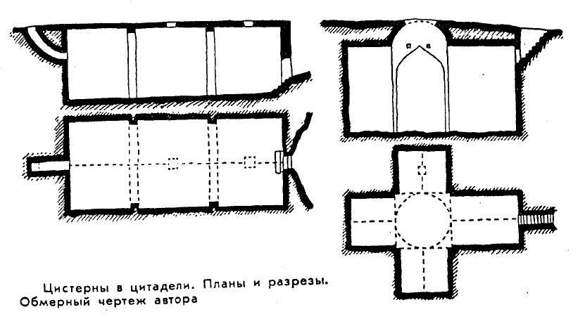 Кстати, наличие бань напоминает о главном в любой крепости – о воде. И вот с водой в крепости было всё хорошо. До сих пор на её территории исправно трудятся несколько родников. Например, это Хаибулах (Ханский источник), Дгиарчи-булах (Источник вестника). А ещё есть несколько специальных резервуаров для хранения драгоценной влаги. Один из таких подземных резервуаров, имеющих необычную крестообразную форму, как-то решили изучить подробнее и неожиданно выяснилось, что когда-то это был христианский храм. Такое открытие ещё раз напоминает о том, насколько мало сейчас известно науке о Дербенте вообще и крепости Нарын-Кала в частности. Вот схема этого подземного храма из того же источника: