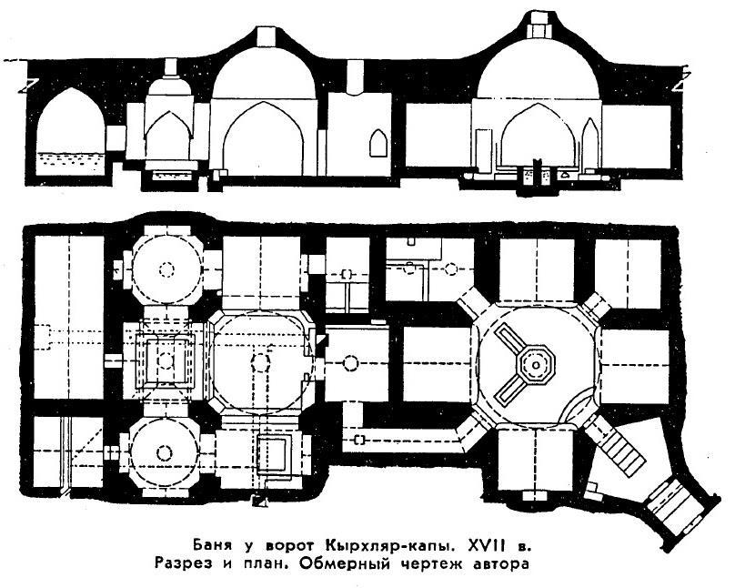 Название самой крепости сейчас звучит, как Нарын-Кала. Причём именно «звучит», так как никто точно не знает, что означает это словосочетание. Чаще всего его переводят, как «Солнечная крепость» или как «Крепость-Солнце». Такой вариант перевода поневоле наталкивает на мысль, что название появилось задолго до появления тоталитарных религий вроде Христианства или Мусульманства и относит нас ко временам Солнцепоклонников или к Ведизму. Впрочем, от тех времён осталось очень мало, да и то – под землёй ещё. Сейчас же наиболее значимые архитектурные памятники относятся к мусульманскому периоду, сильно «подправленному» во времена Петра Великого, когда взявшие крепость русские войска занялись здесь серьёзным капитальным строительством. Мечети, ясное дело, при этом никто не трогал, да и не только мечети. Остались, например, до нашего времени очень интересные бани. Вот схема одного такого неординарного сооружения (см. сайт http://whc.unesco.org/uploads/nominations/1070.pdf ):