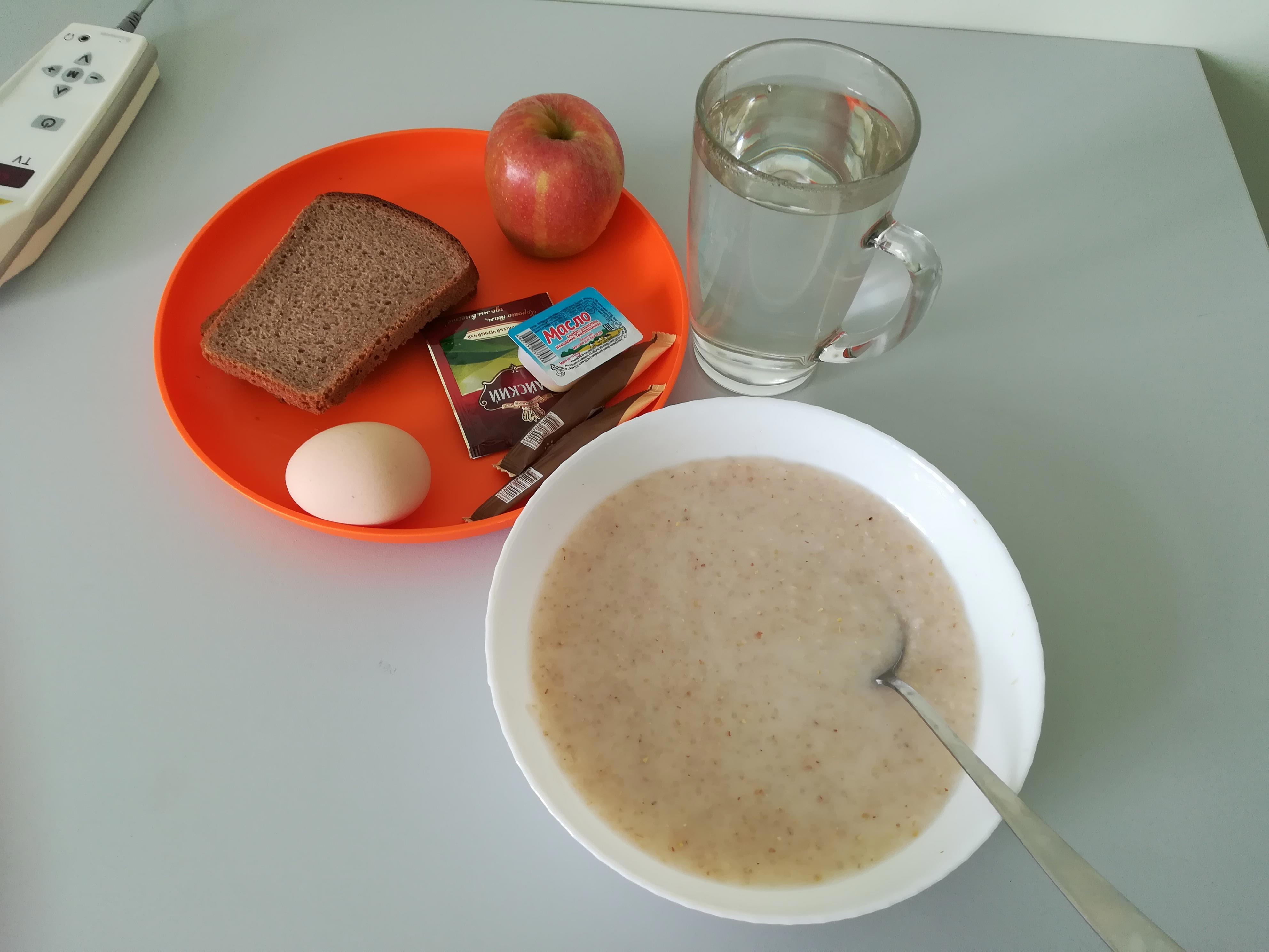 Туалет и душевая на 2 палаты, одна одноместная, вторая двух, но сейчас я уже одна в ней. Еду возят в палату, кормят нормально, кефир, шиповник. Больничный натюрморт))
