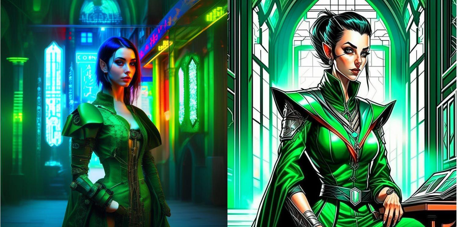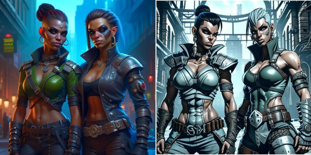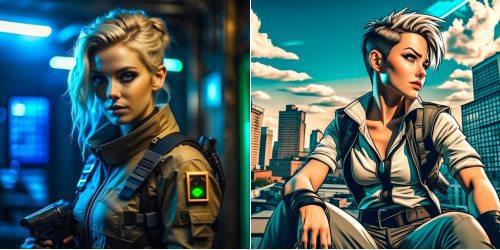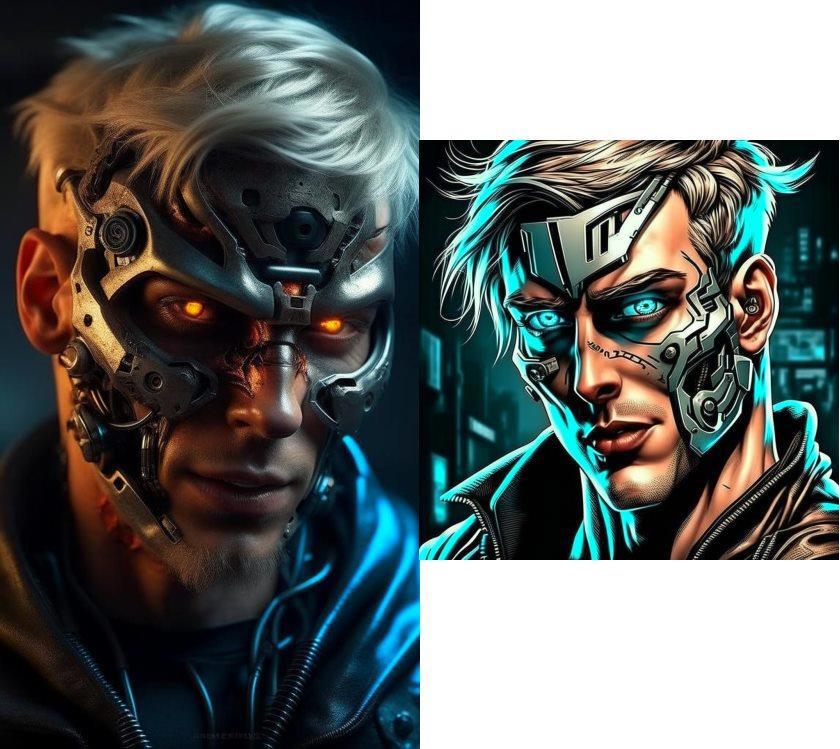 Они же сгенерированные с нуля. Обе версии мои, в левой задавал условия на освещение и оно получилось более мягким чем при просто включенном "киберпанке".