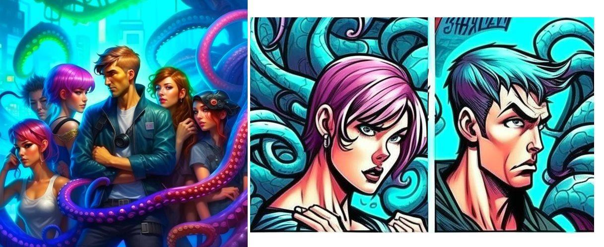 Подводя итоги могу сказать, что эксперимент удался. Персонажи получились более выразительные (на мой вкус), времени на это я много не потратил (кроме Кузи, падлы))). Я конечно не ожидаю, что Евгений послушается моего совета или на АТ появятся полноценные комиксы, но надеюсь, что авторы, самостоятельно генерирующие обложки начнут использовать более разнообразные стили. От обилия анимешных девочек и принцев на обложках уже мутит, книги с однотипными картинками в разделе новинки я уже просто пролистываю, даже не вчитываясь в аннотации. "Великий и ужасный" со своими реалистичными киберпанковскими иллюстрациями даёт фору многим другим произведениям.