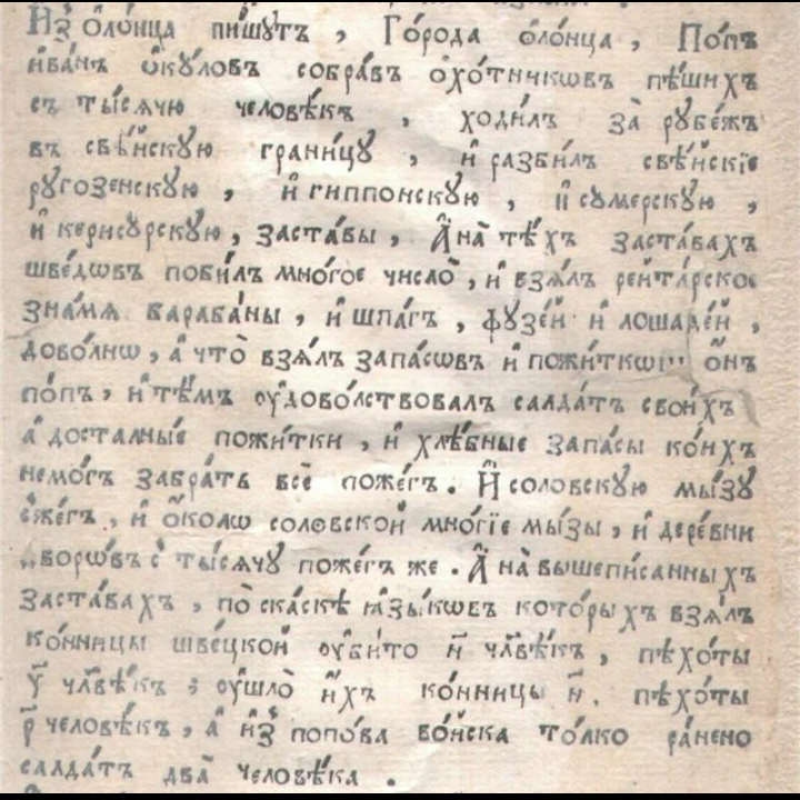 "Из Олонца пишут. Города Олонца поп Иван Окулов собрав охотников пеших с тысячу человек ходил за рубеж в свейскую границу и разбил свейские Ругозенскую и Гиппонскую и Сумерскую и Керисурскую заставы. А на тех заставах шведов побил многое число и взял рейтарское знамя барабаны и шпаг фузей и лошадей довольно, а что взял запасов и пожитков он поп и тем удоволствовал салдат своих, а досталные пожитки и хлебные запасы коих немог забрать все пожег. И соловскую мызу сжег и около соловской многие мызы и деревни дворов с тысячу пожег же. А на вышеписанных заставах по скаске языков которых взял конницы швецкой убито 50 человек пехоты 90 человек и ушло их конницы 50 человек пехоты 100 человек, а из попова войска толко ранено салдат два человека"