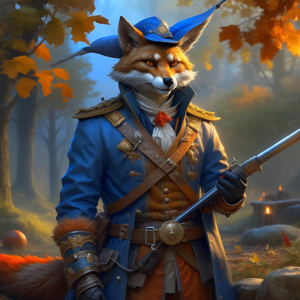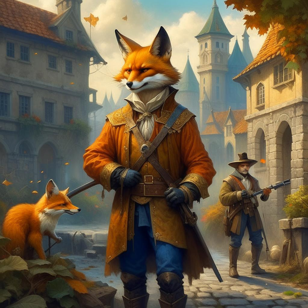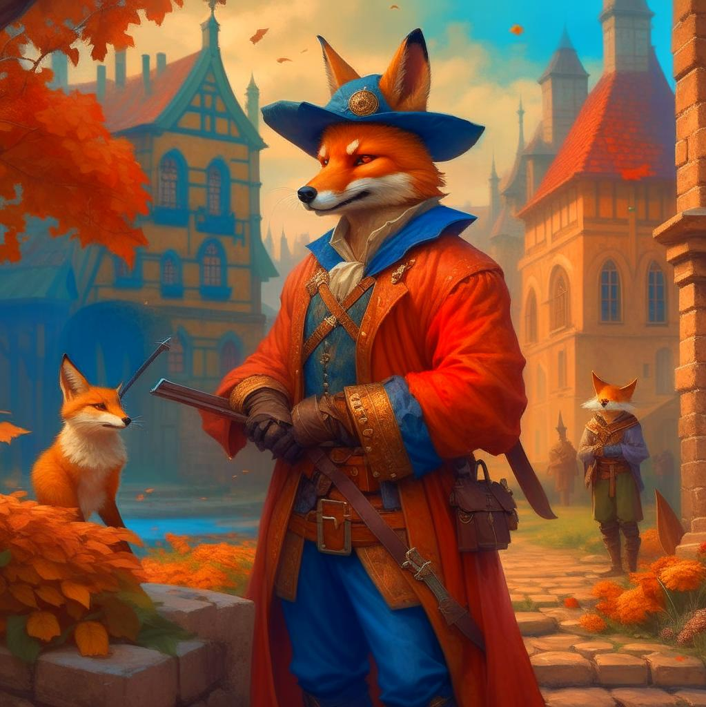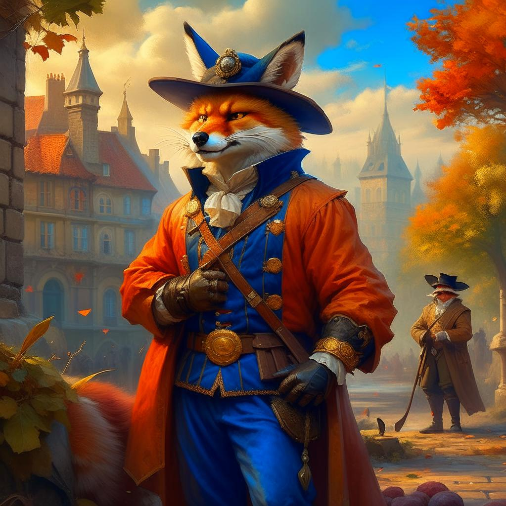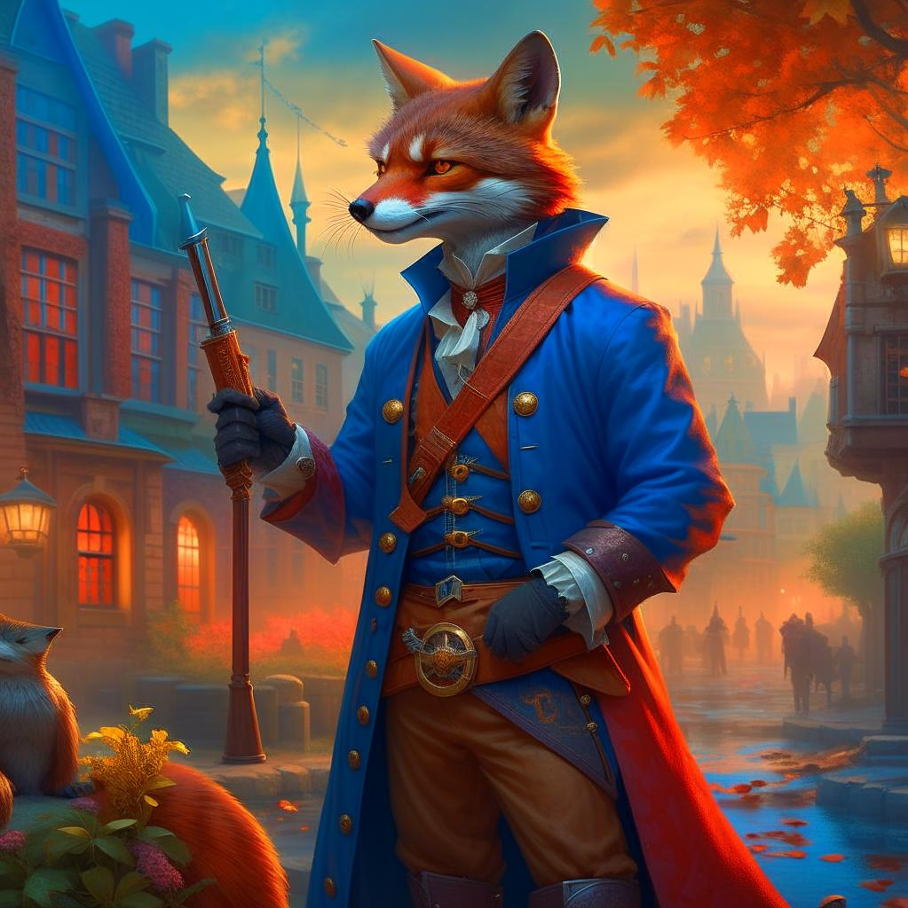 Автор: Александр СмирновЕсть такой роман Майкла Муркока - "Город в осенних звездах" (хроники семьи фон Бек). Одним из персонажей которого, являлся Лис (если мне память не изменяет)... отчего попросил (ну, получилось же с обезьянами) у нейросети нарисовать такого персонажа... Вот что из этого получилось.