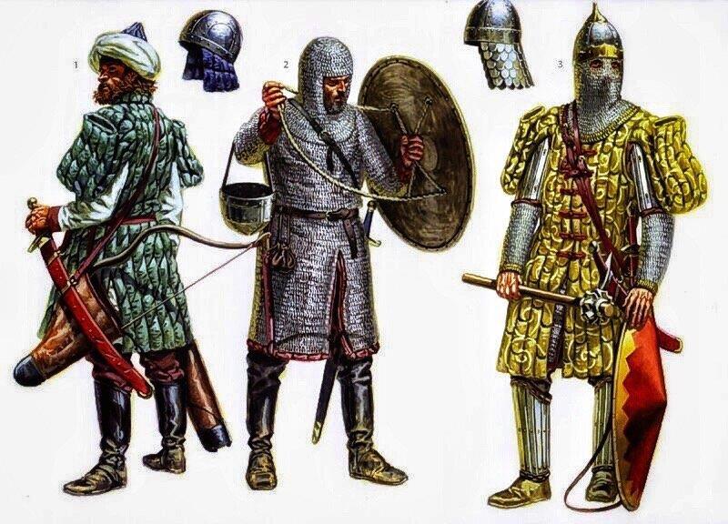 Плюсом этой системы стала возможность довольно быстро воссоздать относительно боеспосоьную по феодальным меркам армию за относительно небольшой промежуток времени - а главное, с минимальными потерями из личной казны базилевса. Из минусов... О, их очень много! Во-первых, совершенно разный уровень подготовки и реального вооружения и бронирования прониариев. Может те, кто побогаче, и приобрёл себе полный набор ламеллярной брони. Но остальные ограничивались стандартной для франкских рыцарей кольчугой - тем более, создание феодального войска Византии шло под сильным влиянием европейского рыцарства. Ранее у Восточного Рима была средняя конница-курсорес, ну так прониарии её и возродили. Разницу между ними и гвардейцами клибанофорами можно увидеть на картинке. Слева лёгкий всадник, возможно из печенегов на ромейской службе, по центру прониарий-курсорес, справа гвардеец-клибанофор. Чуете разницу?