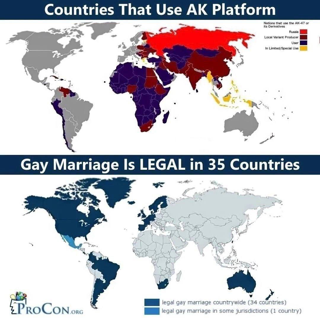 Интересное наблюдение: в странах, которые используют/производят автоматы на платформе «АК-47», не разрешены однополые браки. Кроме ЮАР, но это будем считать единственной статистической погрешностью и ненадолго.