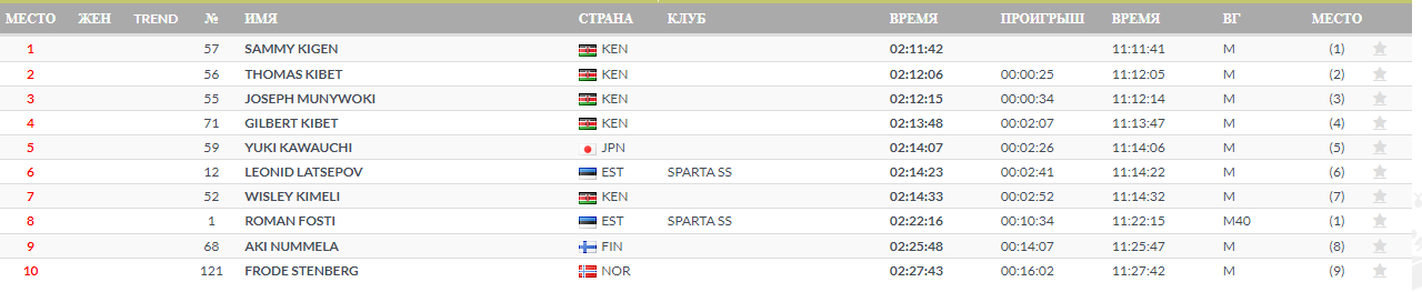 Вот скрин ТОП-10 финишного протокола Таллинского марафона 2023:
