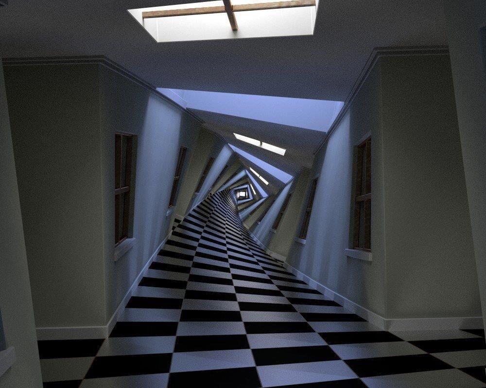 Конечно же, на зеркальный коридор уводящий в бесконечность.