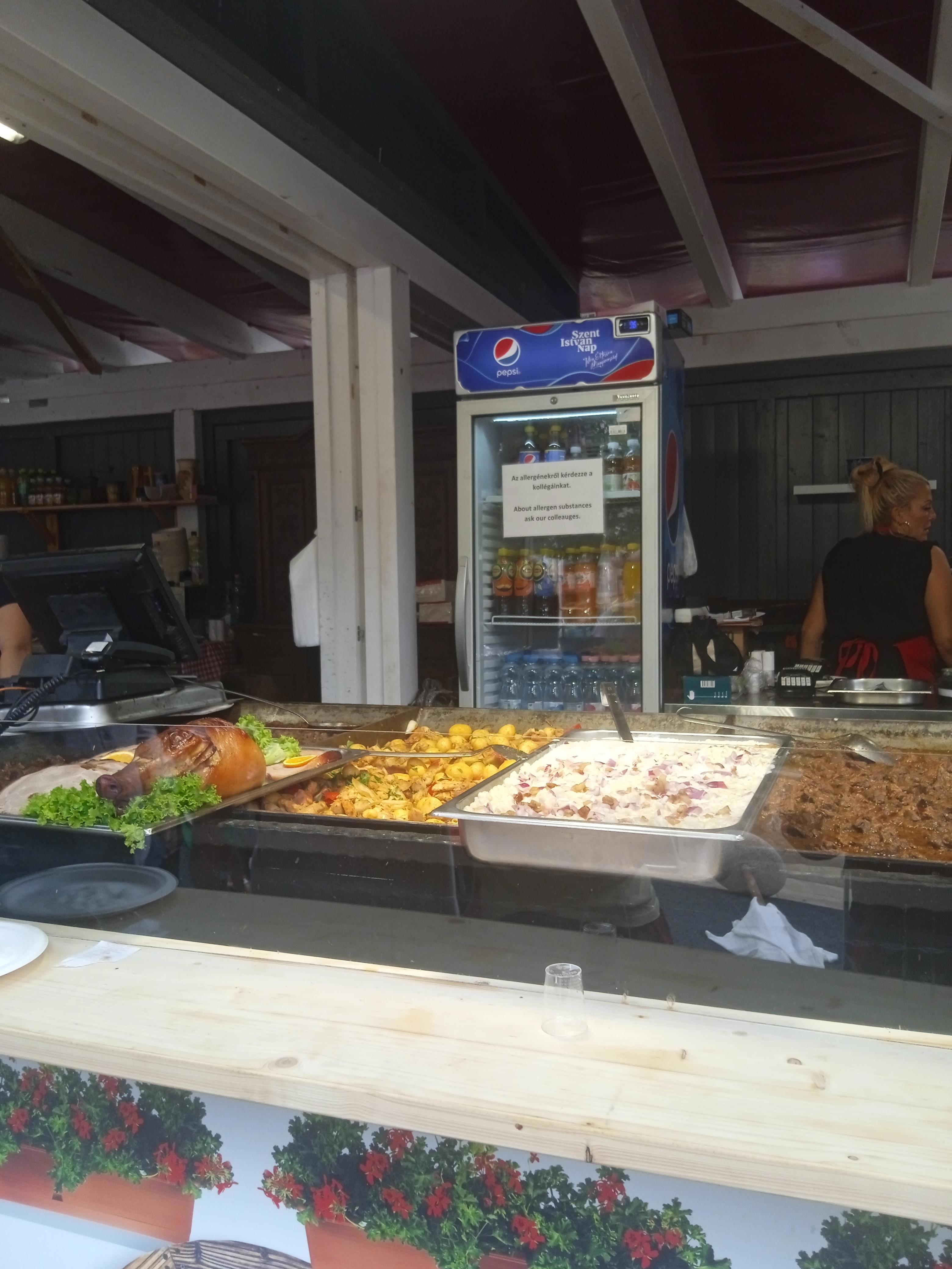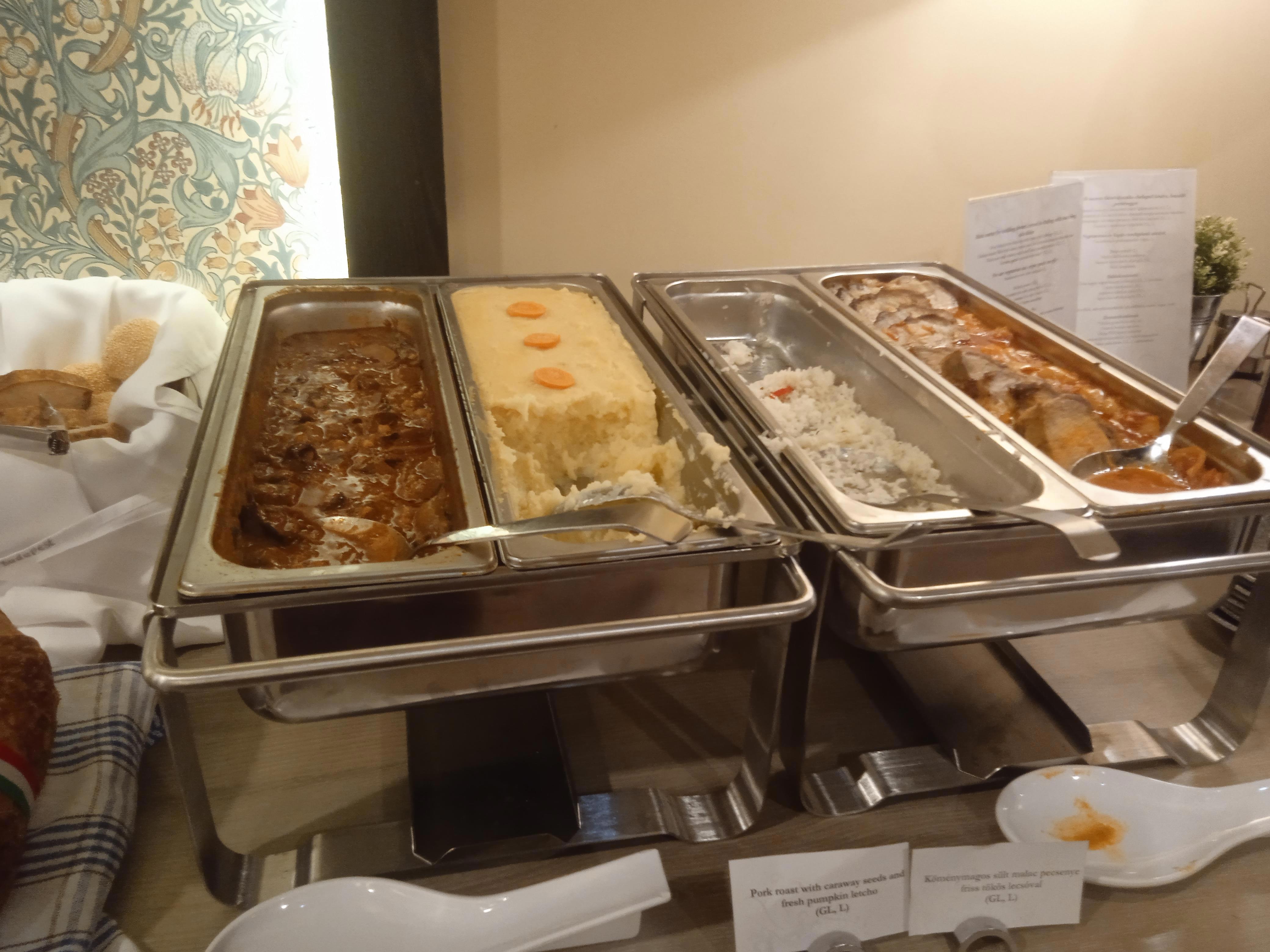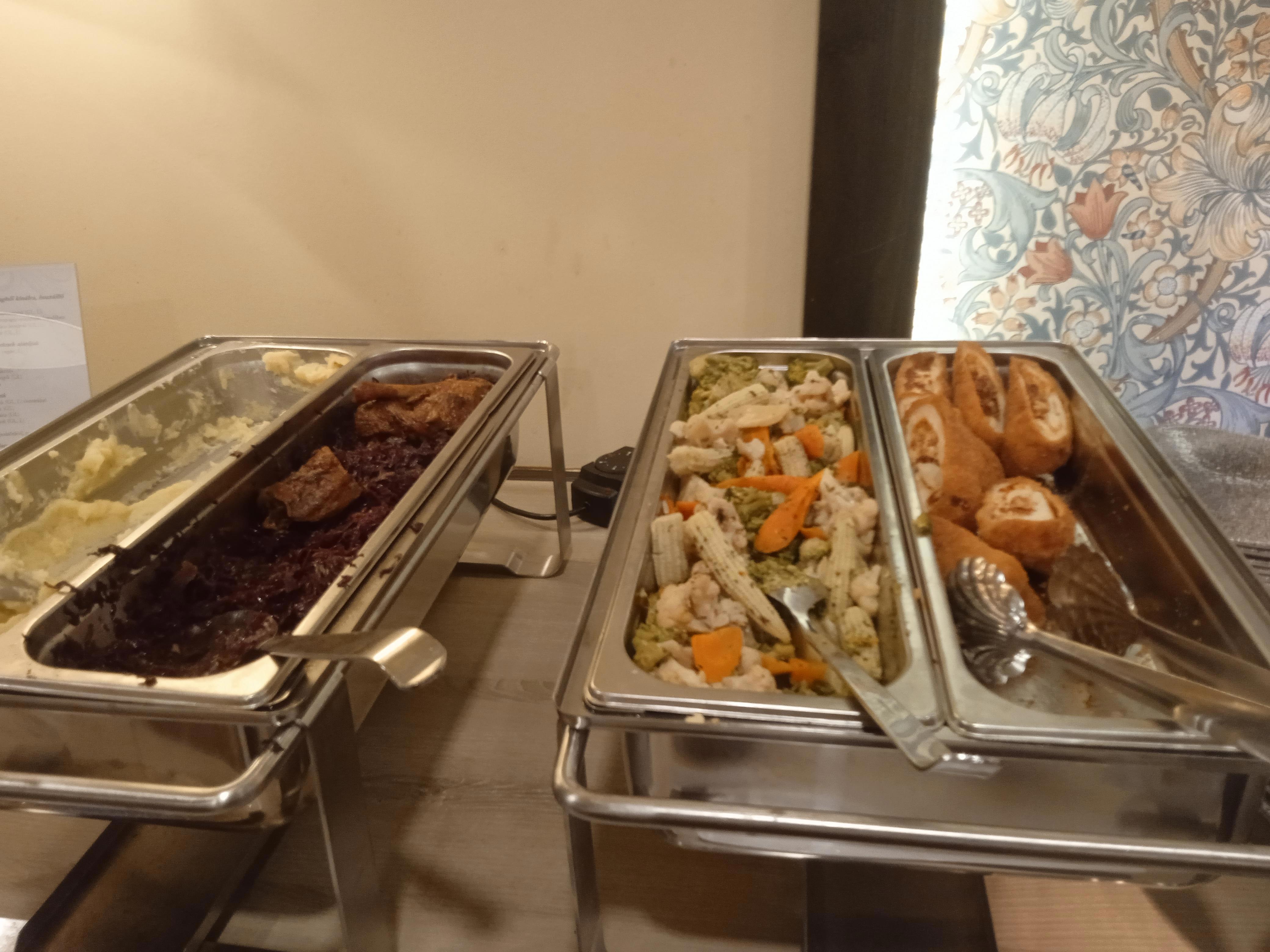 Что удивило. Порциями подают только какой-то традиционный суп. Первое блюдо. А потом гости сами подходят к шведскому столу и набирают то, что хотят. Самой вкусной вещью для меня была утка на подушке из тушеной красной капусты, дичь в каком-то соусе и маринованные остро-сладкие перцы