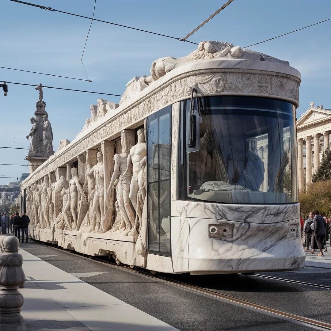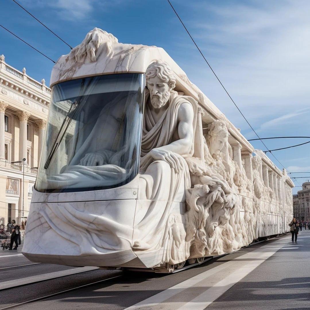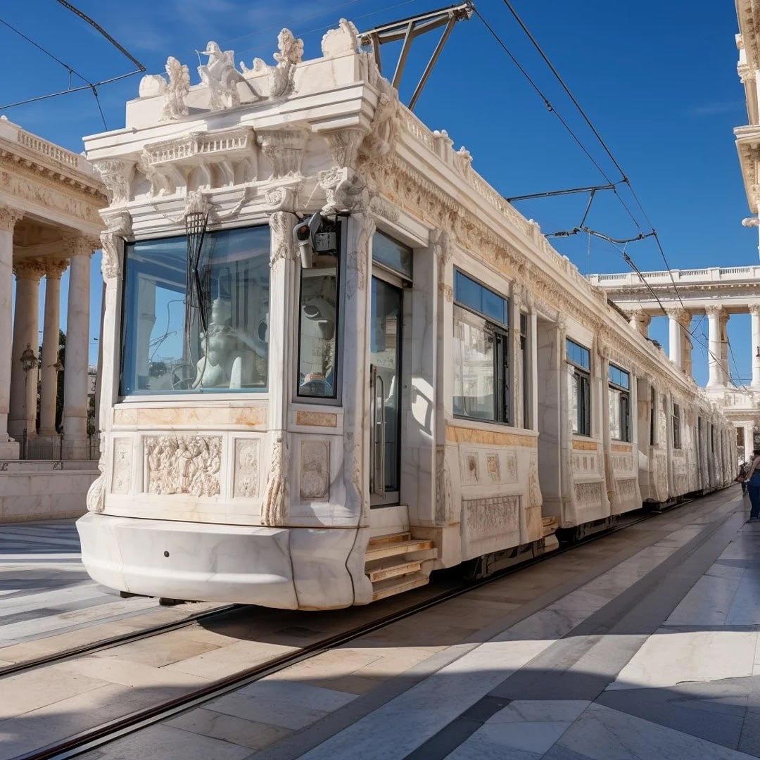 Уважаемый искусственный интеллект, как выглядели бы трамваи в Древней Греции?