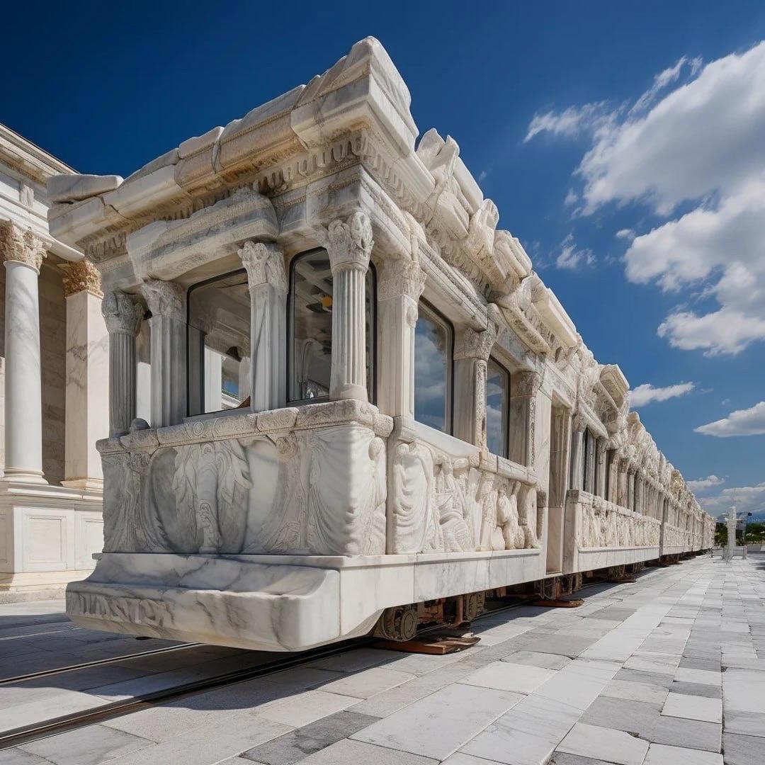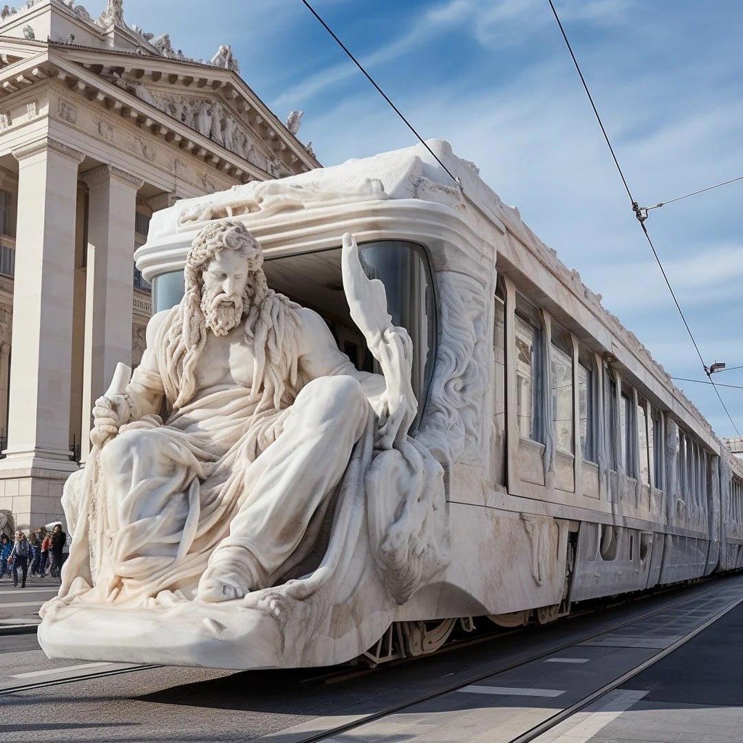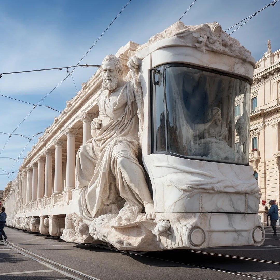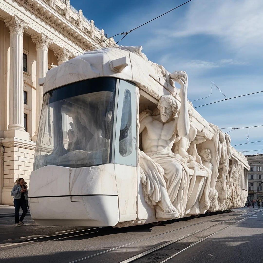 Уважаемый искусственный интеллект, как выглядели бы трамваи в Древней Греции?
