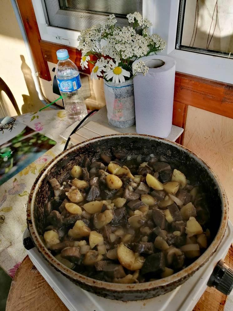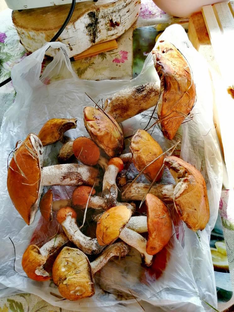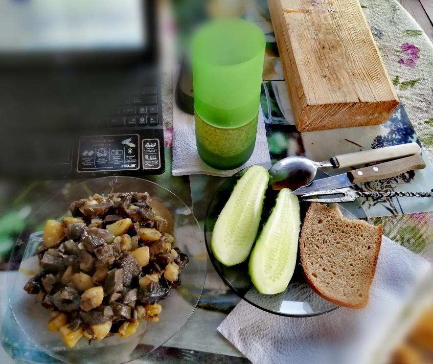 Чтобы вы не подумали, что я только гуляю, доложу, что после купания некоторое время прилежно косила траву электротриммером, а потом занялась приготовлением ужина из подосиновика с добавлением выращенных самостоятельно картошки и лука. Огурец из-под ближайшей яблони (она пока что с палец толщиной, яблоки (32 штуки) уже сняты и частично съедены).