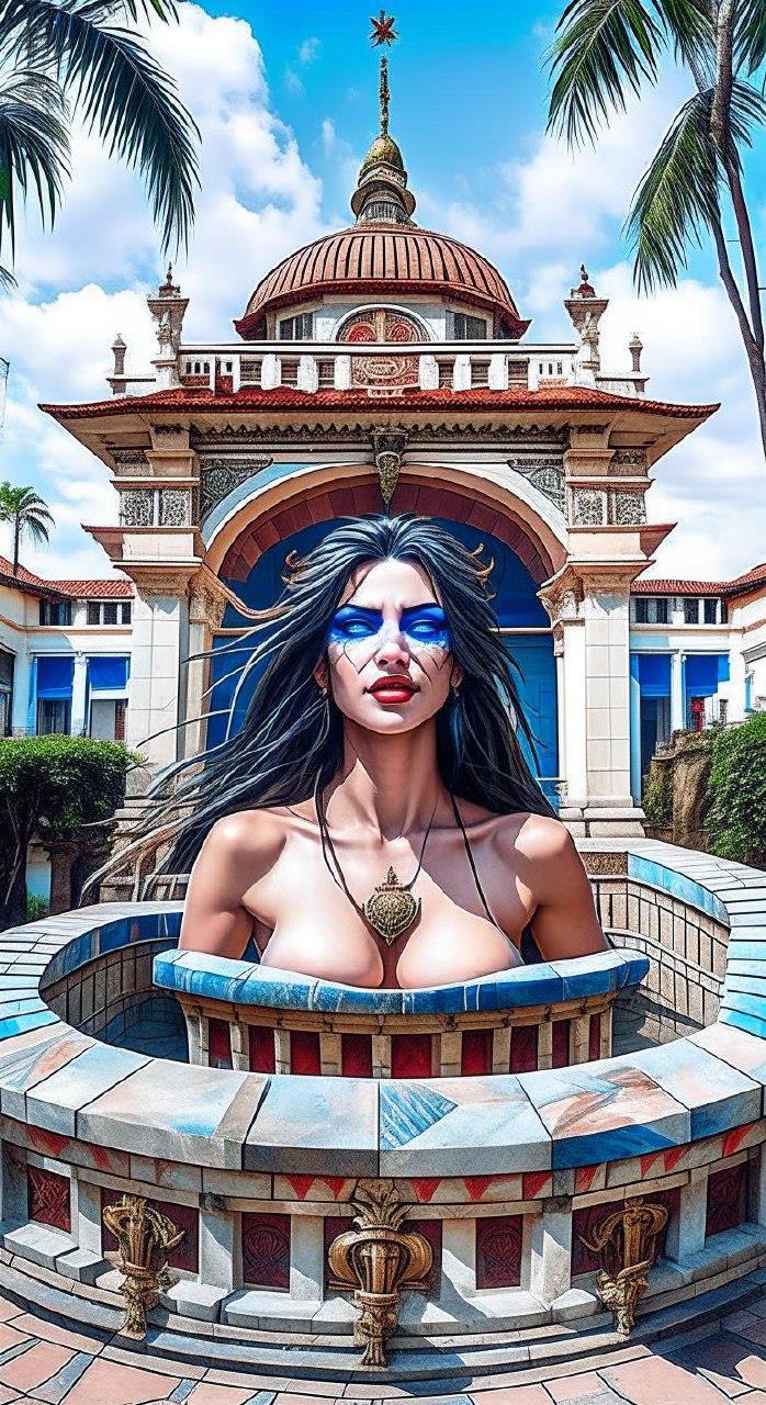 А тут вроде девушка должна быть рядом с домом, а как вы видите, она просто вмонтирована в фонтан
