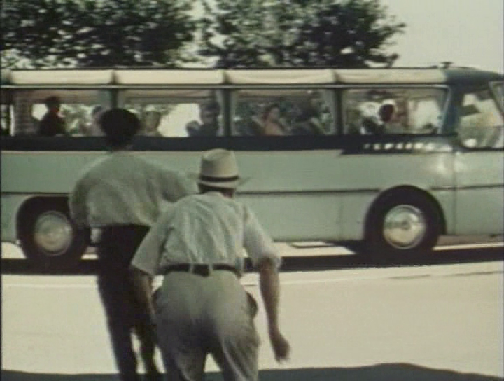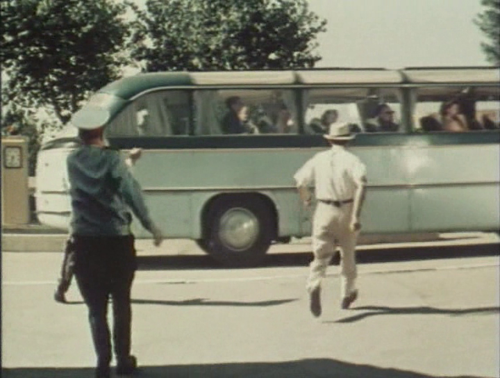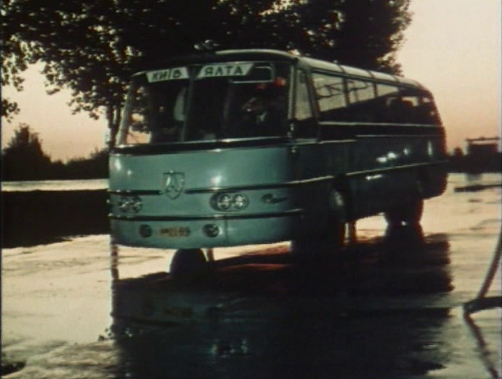 Что это? Судя по логотипу - большой букве "Л" - тоже ЛАЗ, но такой модели я не видела больше нигде: ни в реале, ни в фильмах. Это экспериментальный "ЛАЗ-Украина-1", который был построен в 1961 году в единственном экземпляре! Первый ЛАЗ, получивший восьмицилиндровый двигатель ЗиЛ-130! Как авторам фильма удалось заполучить его для съёмок, большая загадка для меня, но как приятно, что столь необычный, не серийный, автобус остался увековеченным в фильме.