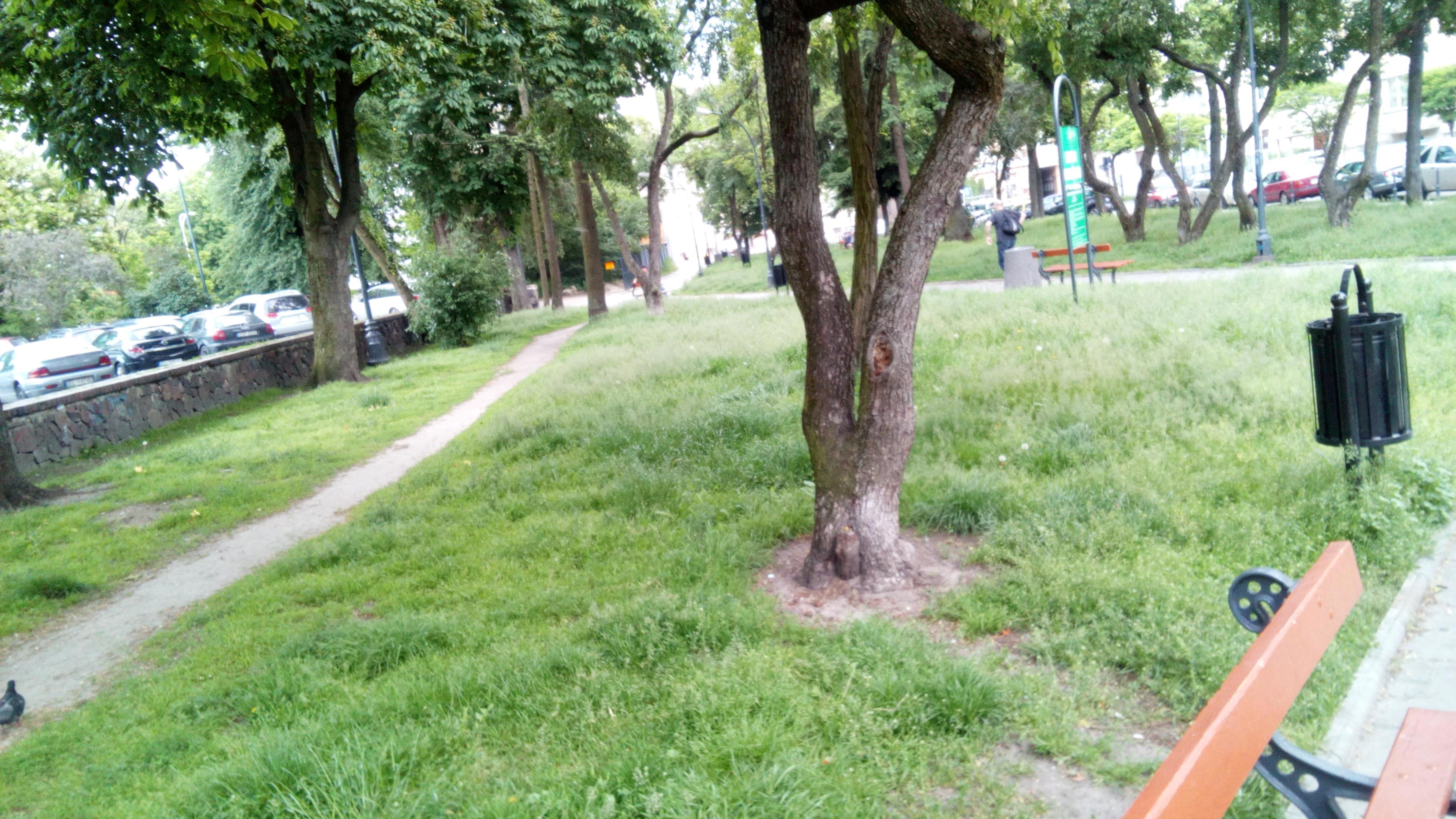Небольшой треугольничек травы перед автостоянкой, десяток деревьев и три, кажется, скамейки. Не знаю, что я ожидал увидеть, но явно не это. Подхожу сфотографировать стенд с названием и вижу на скамейке сладко спящего польского бомжа. Ведьмак все-таки спился?