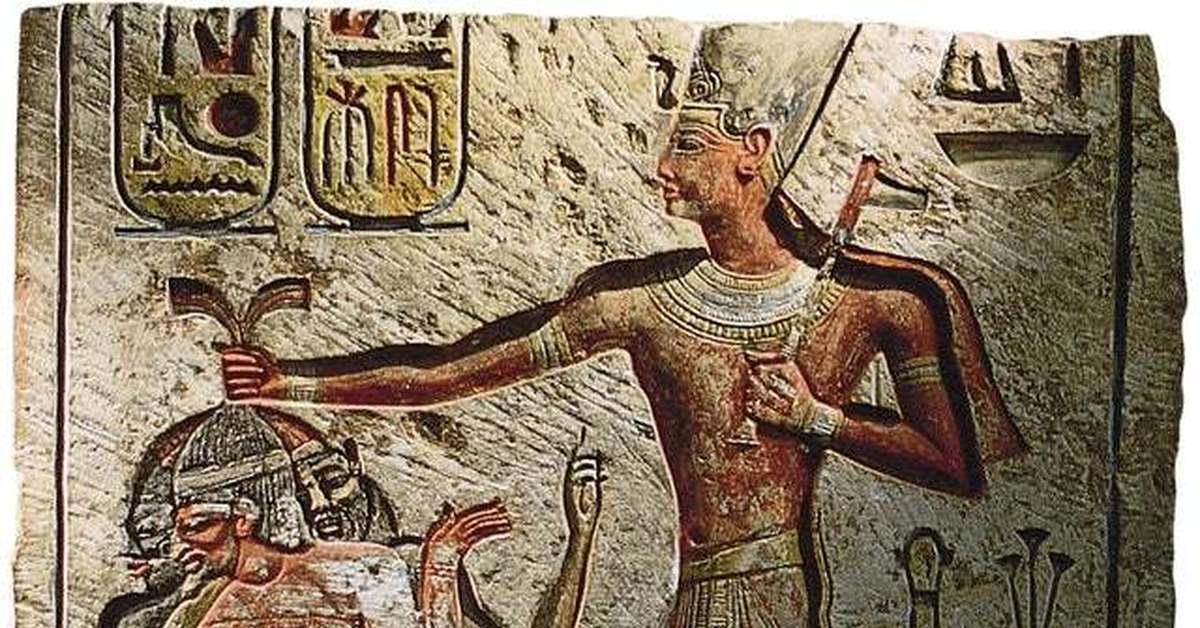 К сожалению изображений царя Небмаарта, повергающего врагов, не сохранилось. Они были, конечно, такие изображения являлись частью пропаганды, но, увы, утрачены. А это рельеф царя Рамзеса II из города Мемфис, который правил на сто лет позже. Но врагов он держит за волосы точно так же, как и все его многочисленные предшественники, начиная со времен Древнего царства.