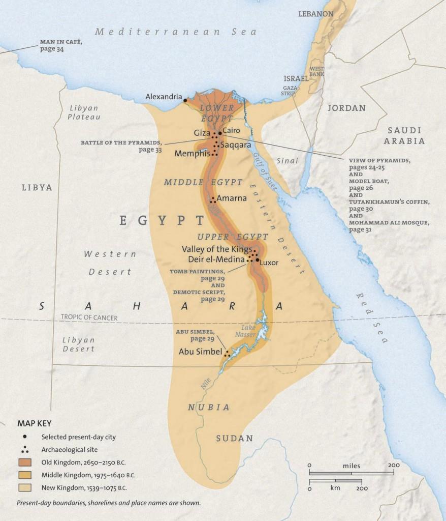 Карта, показывает, как росла территория государства от Древнего царства (самая темная область) до Нового царства (самая светлая). История, описанная в романе произошла во времена Нового царства.