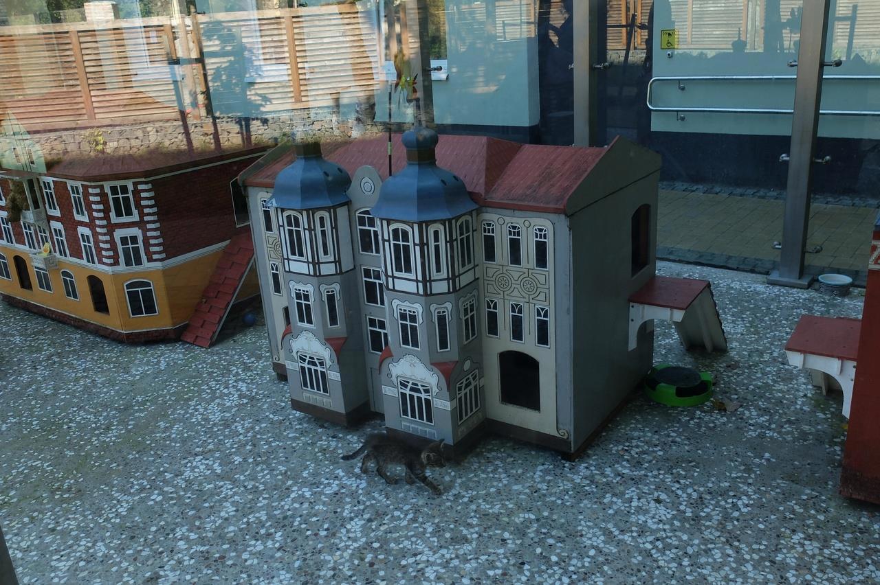 Но для начала - городок для котиков во дворе. Огорожен прозрачной стеной с проходами, достаточными для котиков, но маленькими для собак. В домиках - лежанки: