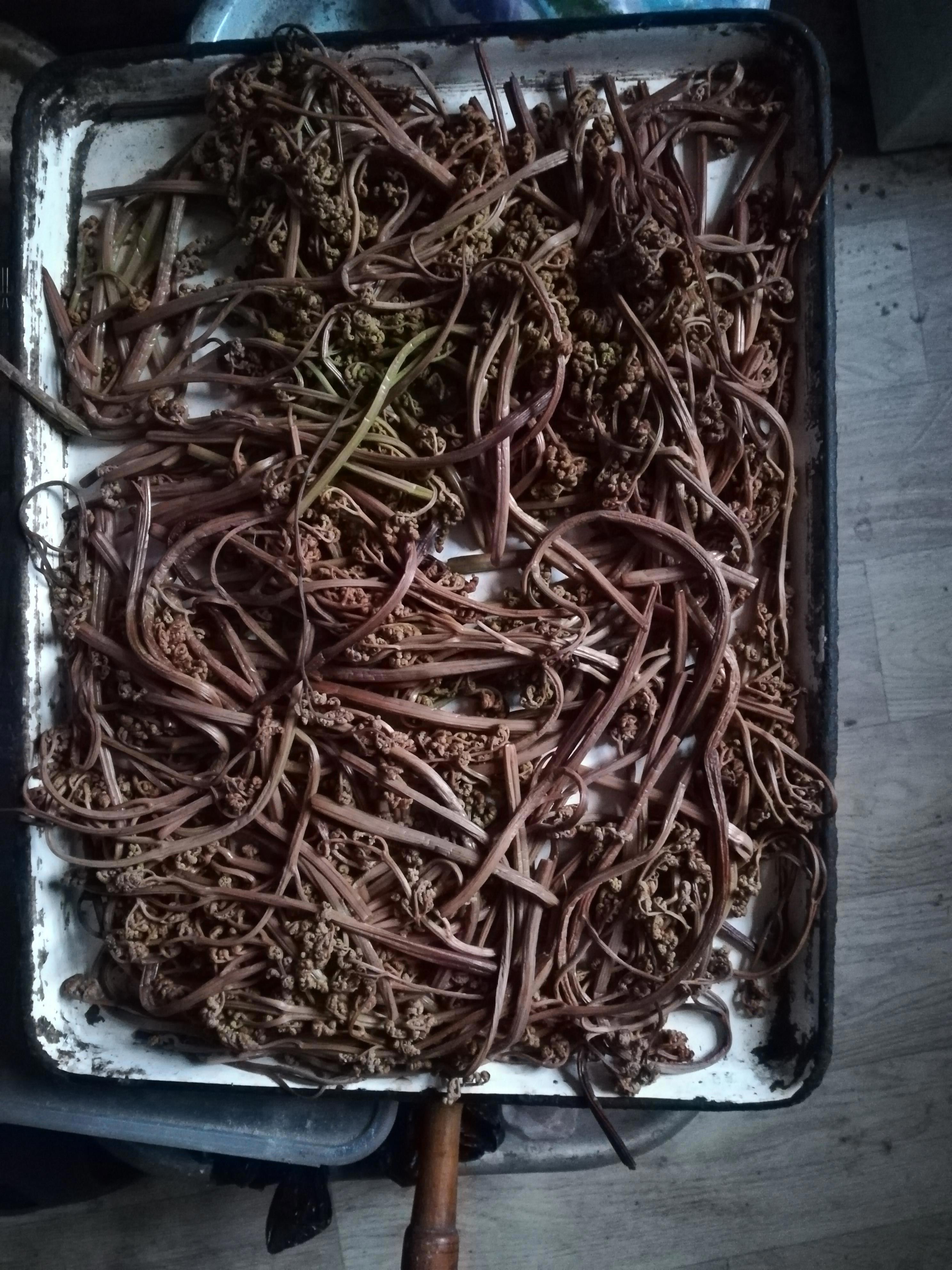 Папоротник уже варёный, сушится. Скоро высохнет до состояния ниточек, которые потом можно будет отварить и снова превратить в полноценный продукт. Говорят имеет грибной вкус, но я не знаю - не люблю азиатскую кухню в принципе, так что папоротник ел когда-то давным-давно в детстве.