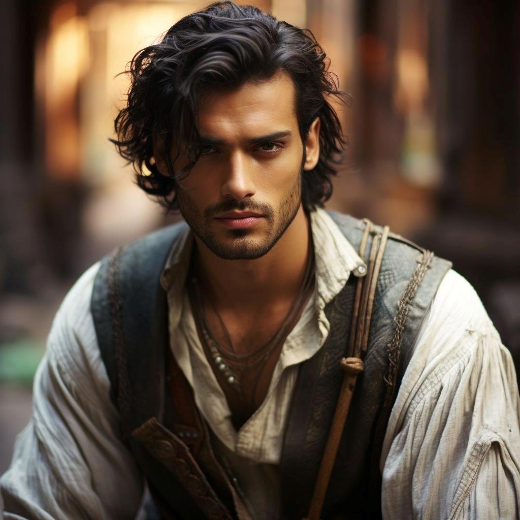 Нос его был крупен, с небольшой горбинкой. Над губами тонкой перекладиной расположились усы, стрелами спускаясь вниз и аккуратно смыкаясь на волевом подбородке с характерной ямочкой. Волосы его лежали густой непокорной волнистой шапкой.