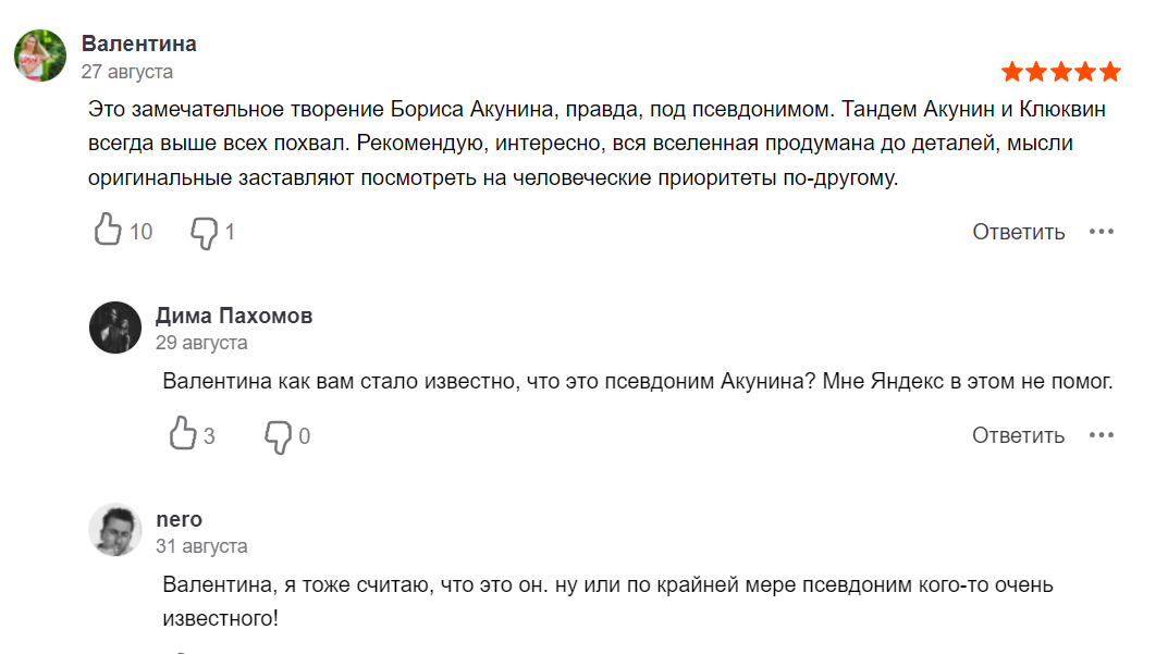 Народ, а почему меня все сравнивают с Акуниным? Я просто его не читал и узнал о нем только после того, как начали сравнивать. Реально что-то похоже? Или почему?