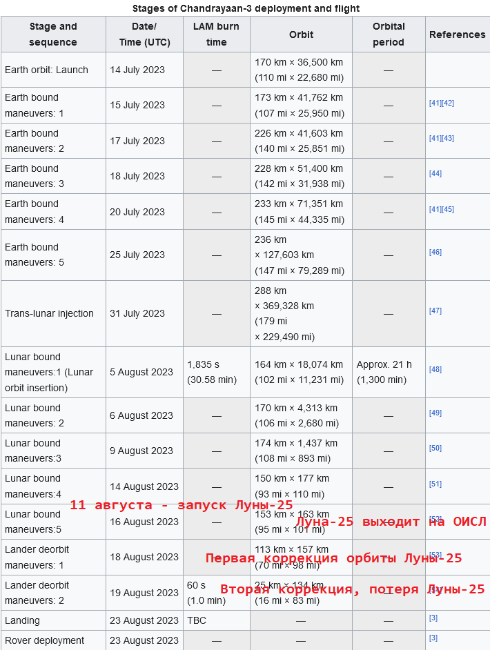 Альтернатива — летать по встроенному таймеру БЦВК, который сломается разве что вместе со всей БЦВК. Требуется точное знание параметров орбиты станции и двигатель выдающий строго F тяги по модулю. И нет для позиционирования совсем не обязательно ставить приводные маяки. Достаточно понаблюдать с Земли за движением станции по окололунной орбите, включая моменты ухода за Луну и выхода из-за нее — то чем астрономы занимались со времен первых телескопов и законов Кеплера. Собственно Чандраян-3 летел медленно не только из-за малой тяги двигателя перелетного модуля (я так понял апогейник от геостационарного спутника связи), но и больших интервалов между маневрами — судя по всему набирали статистику наблюдений. Так 19 августа обе станции выходили на предпосадочную орбиту, но если Луна-25 по плану должна была садиться уже 21 августа, то Чандраян ждал на новой орбите до 23 августа.