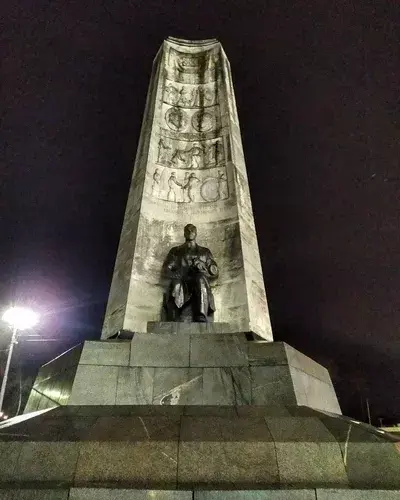 В любом случае, в данный момент памятник представляет собой белокаменную 22-метровую стелу, сложенную из кирпича и облицованную известняком и гранитом. Основание памятника облицовано тёмным мрамором.
