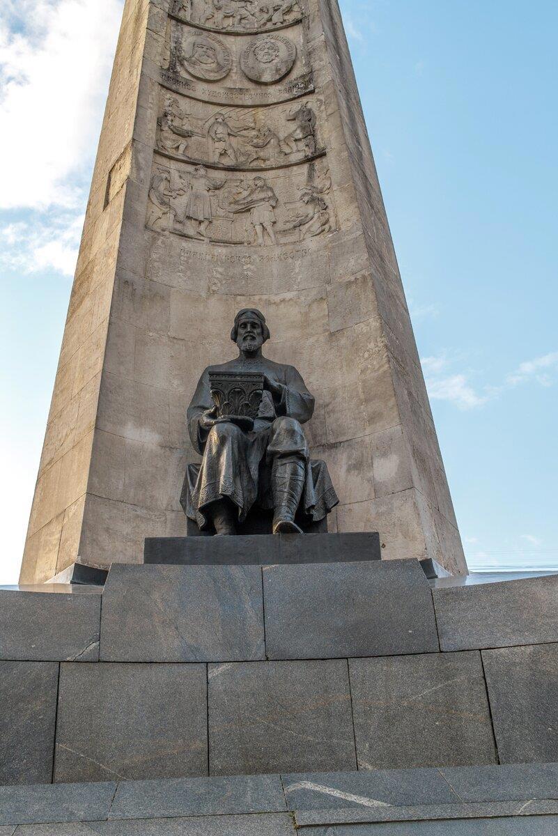 Над бронзовыми фигурами высечены барельефы иллюстрирующие наиболее важные страницы истории города и его героев.