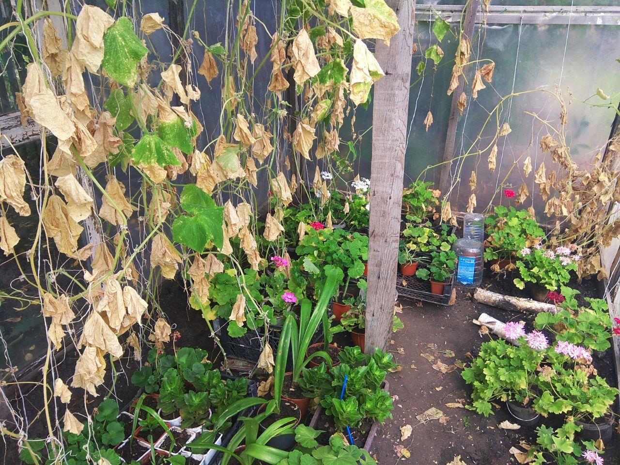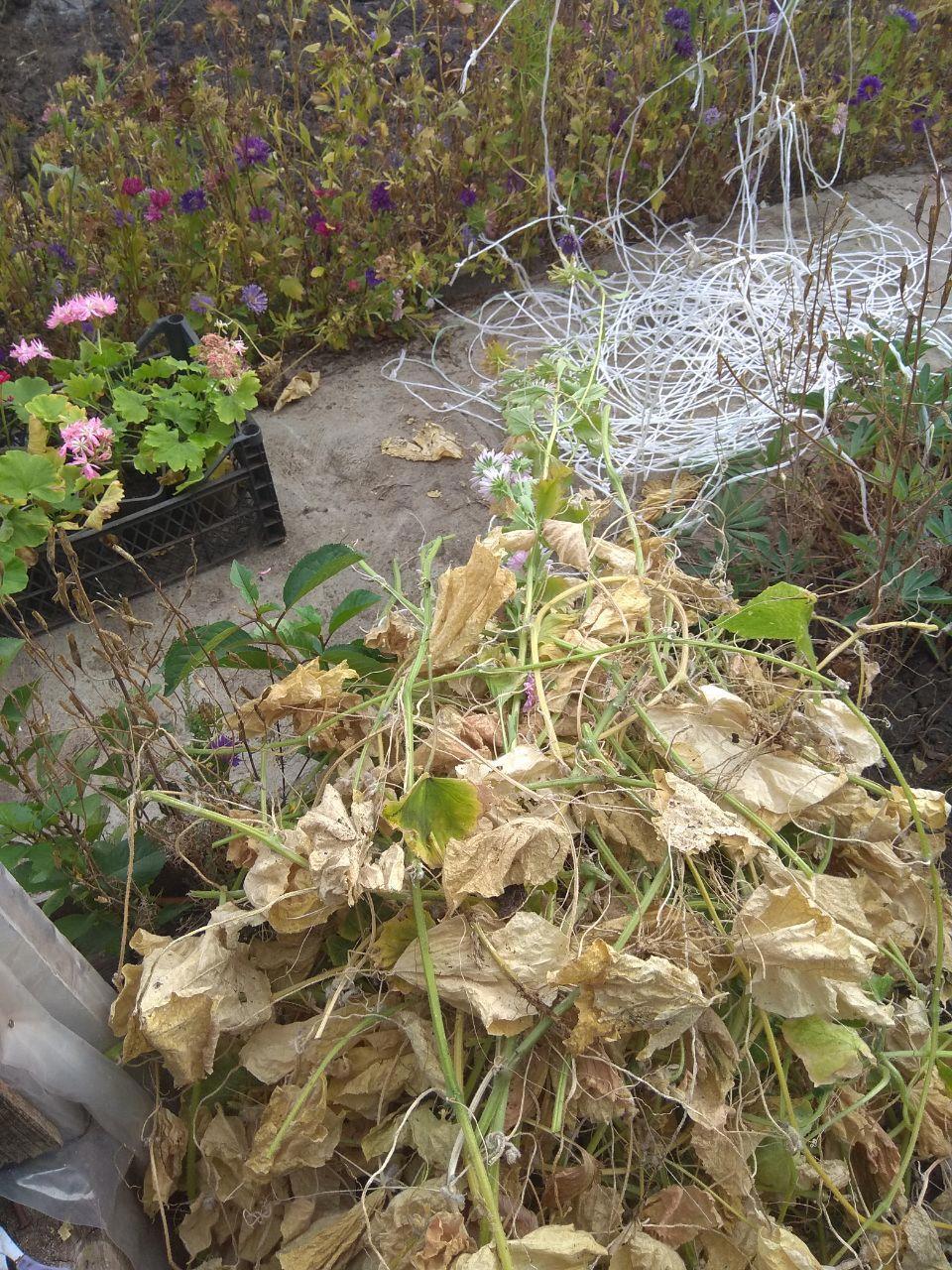Нужно было убрать отжившие плети огурцов в теплице и около нее. А это непросто. Пока расплетешь все это, ох...