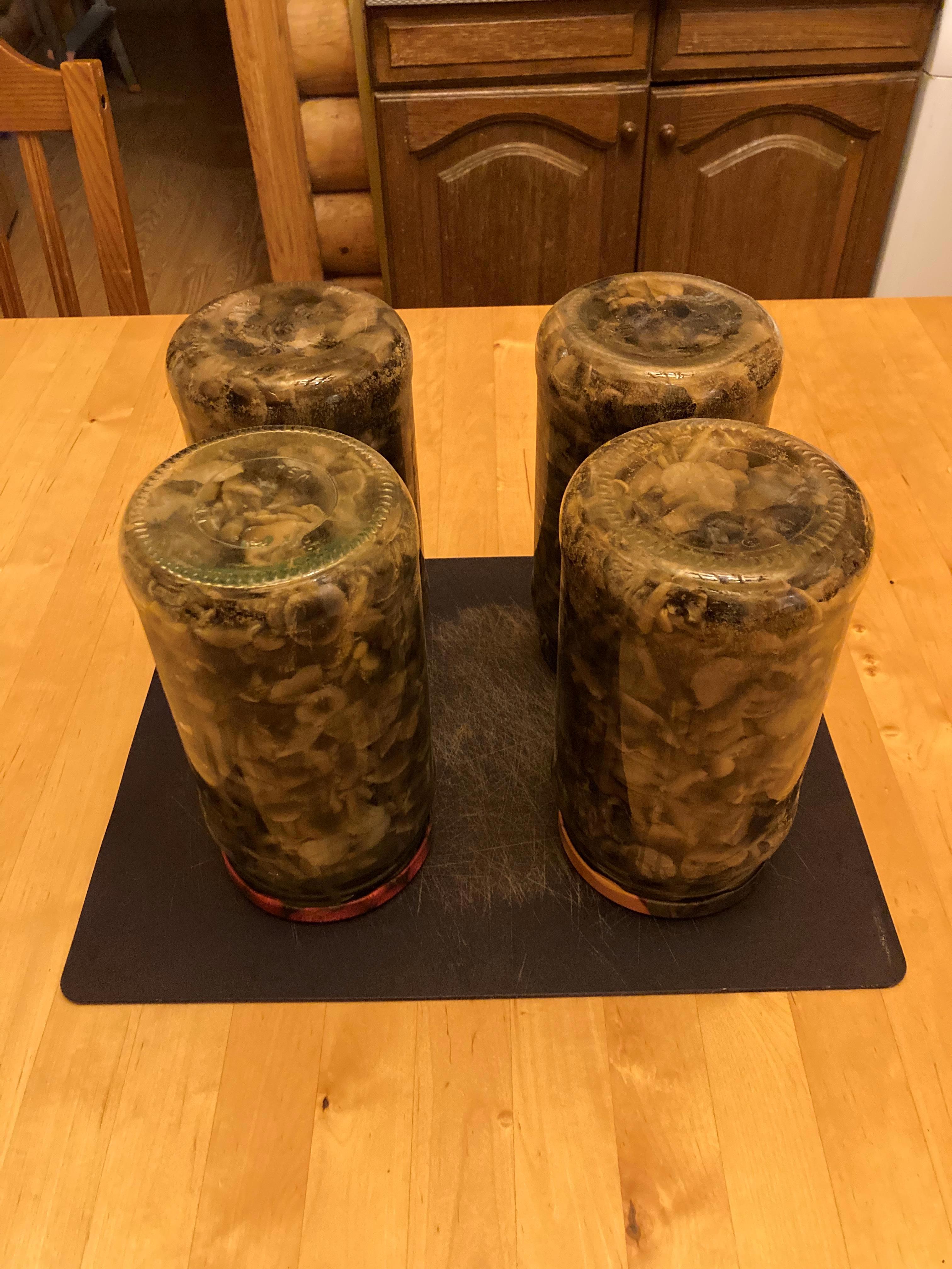 Стерилизуем стеклянные банки, кладем в них вареные грибы, добавляем уксус - по 2 столовые ложки на литр объема банки - и заливаем рассолом, в котором грибы и варились. Стерилизуем банки уже с грибами (литровую - минут 5, полуторалитровую, как на фото - можно 7), закрываем и переворачиваем. Пусть так и остывают: