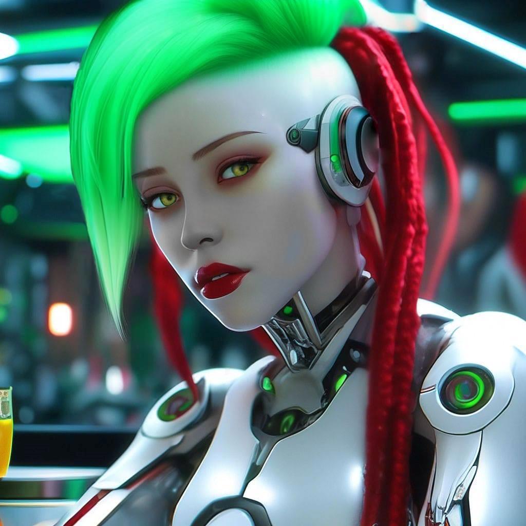 Автор: Василий Груздев Рядом женщина-кибер с кислотно зелеными, разбавленными малиновыми прядями волосами. Сидела, закинув свою металлическую ногу на стол. Одета она при этом была в короткий топ и мини-юбку, от чего светила своим нижним бельем, ничуть этого не смущаясь.