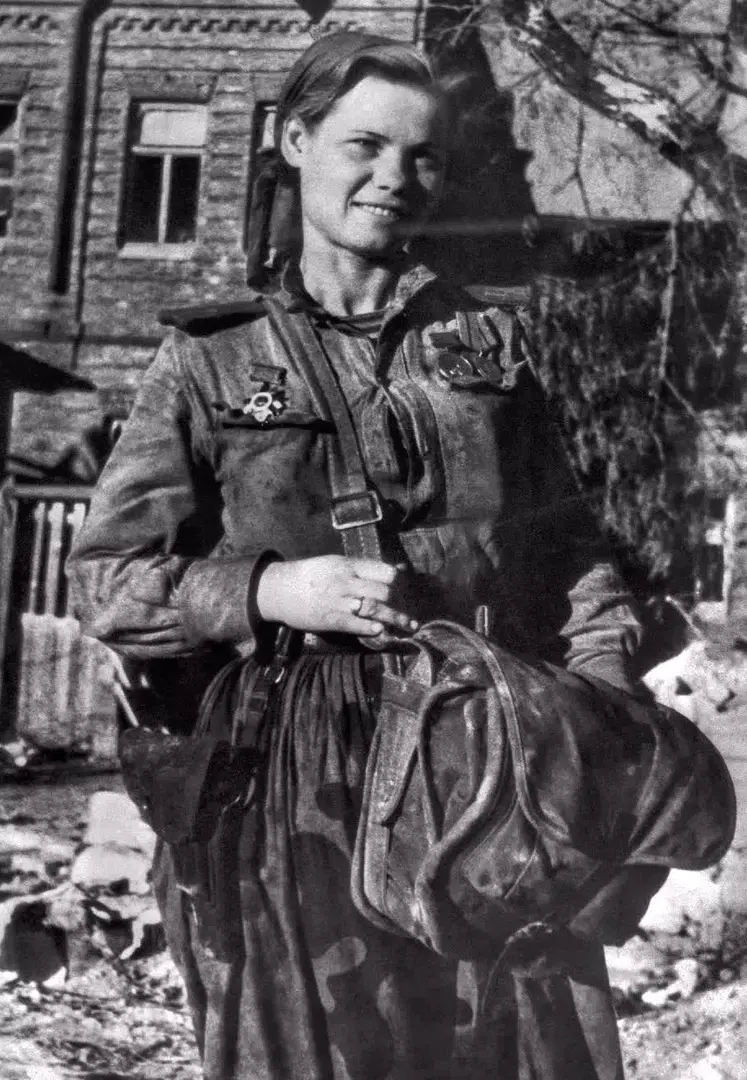 На фото, санинструктор 393-го отдельного батальона морской пехоты Надежда Степановна Лихацкая (год рождения — 1916) в освобождённом Новороссийске. 1943 год.