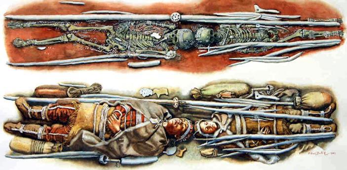 На дне этой неглубокой могилы мужчины были также обнаружены нож и скребло из кремня. Место захоронения окружали кострища, подобные кострищам вокруг курганов вождей восточнославянских племён из кургана Синташта около Аркаима.