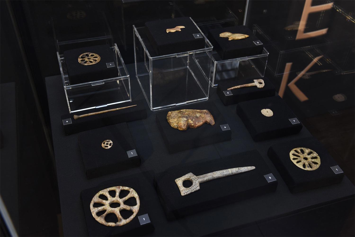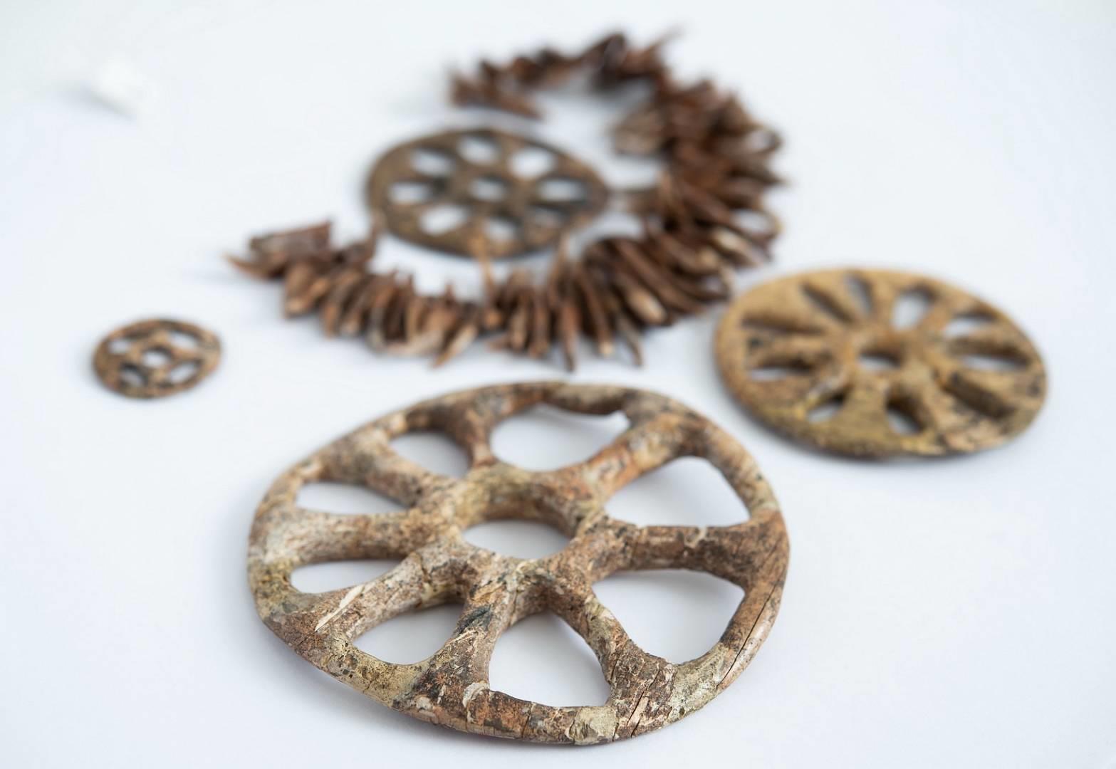 Диски прорезные. Предметы культа. Сунгирь. Палеолит. Бивень мамонта, резьба, шлифовка, сверление. Оригинальная экспозиция, Владимирский исторический музей. г. Владимир