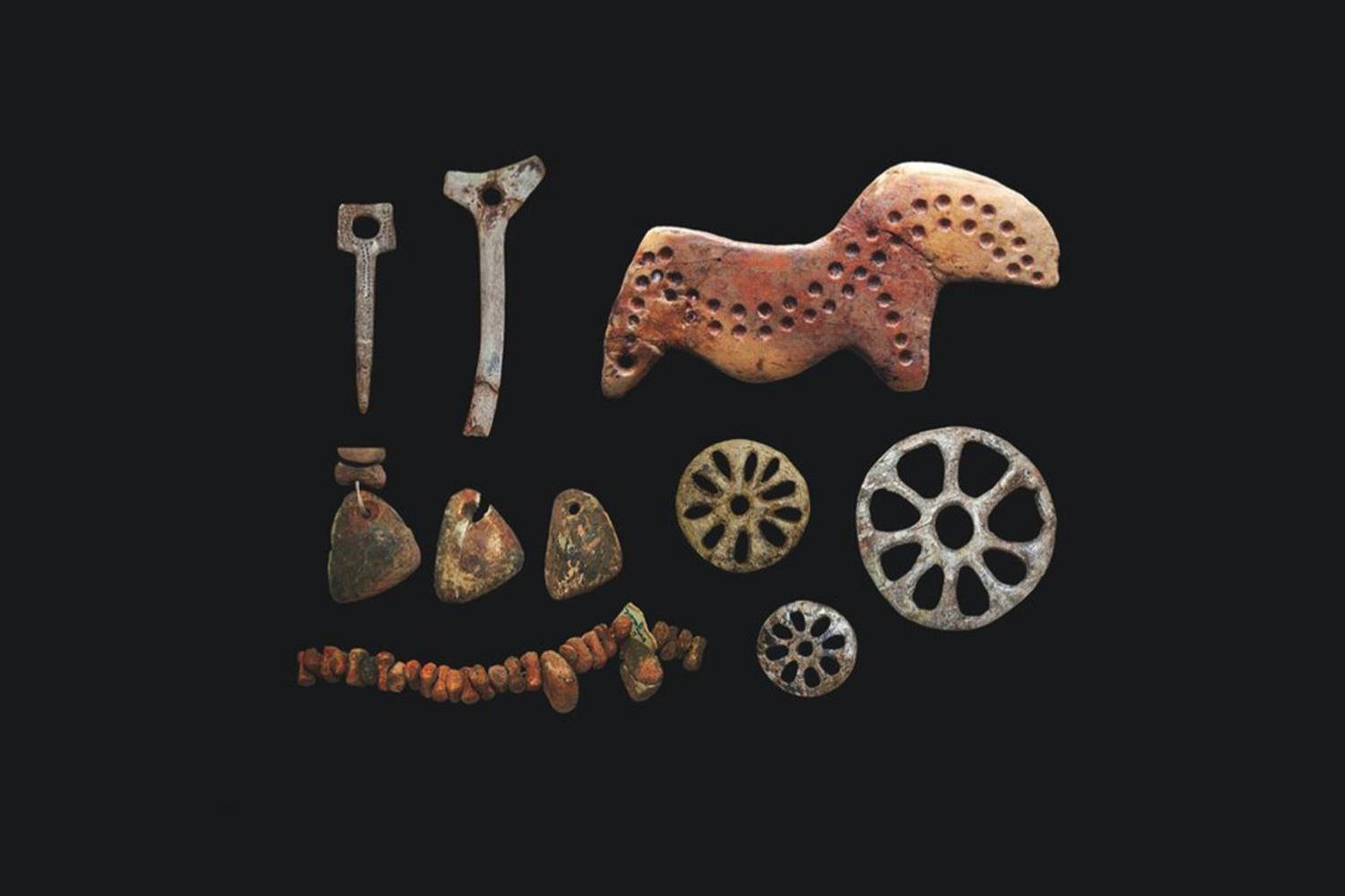 Это четыре прорезных диска из бивня мамонта, четыре «жезла начальника» и две фигурки животных– мамонта и лошади-сайги. Учитывая то, что они были обнаружены в захоронениях, можно предположить, что эти предметы имели культовое назначение.
