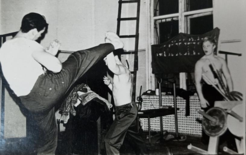 Вот здесь как раз видно, рост Кота и Щегла, которые в паре отрабатывают защиту от удара ноги в голову. На заднем плане Вася "Колган". (Вчера видел его на автобусной остановке, встречал жену с работы. Постарел). Виден самодельный лежак с подставками для штанги. Подставка для блинов. Все делали своими руками. А чтобы нас не выгнали из качалки, лично я ездил в райком комсомола района жаловаться на директора местной фабрики. При мне председатель комсомольской организации позвонил директору и дал ему такой втык, что до самой "перестройки" нас никто не трогал.